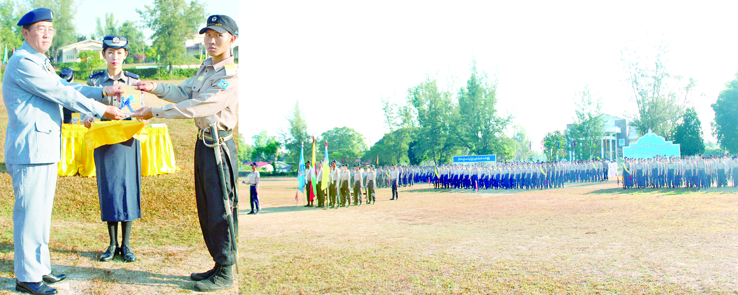 ဦးစွာ သင်တန်းဆင်းတပ်ခွဲက ပါမောက္ခချုပ်အားအလေးပြုပြီး နိုင်ငံတော်အလံအား အလေးပြုကြသည်။