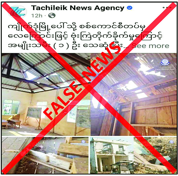 ကရင်ပြည်နယ် ကြာအင်းဆိပ်ကြီးမြို့နယ် ကျိုက်ဒုံမြို့ပေါ်သို့ ဇန်နဝါရီ ၂၃ ရက်တွင် လုံခြုံရေးတပ်ဖွဲ့ဝင်များက လေကြောင်းမှ ဗုံးကြဲတိုက်ခိုက်မှုကြောင့် အမျိုးသမီးတစ်ဦး သေဆုံးပြီး အဆောက်အဦးတချို့ ထိမှန်ပျက်စီးခဲ့ကြောင်း မဟုတ်မမှန်သတင်းများကို တရားမဝင်ပြည်ဖျက်မီဒီယာများက လုပ်ကြံရေးသားဖြန့်ဝေလျက်ရှိကြောင်း တွေ့ရှိရသည်။