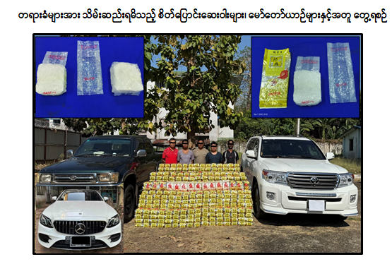 မူးယစ်ဆေးဝါးတားဆီးနှိမ်နင်းရေးရဲတပ်ဖွဲ့မှ တပ်ဖွဲ့ဝင်များပါဝင်သော ပူးပေါင်းအဖွဲ့သည် မတ်လ ၆ ရက်နေ့ ည ၇ နာရီခွဲအချိန် ရန်ကုန်တိုင်းဒေသကြီး၊ ဒဂုံမြို့သစ်(တောင်ပိုင်း)မြို့နယ်၊ (၁၄၄)ရပ်ကွက်၊ ဆင်ဖြူရှင်လမ်း၊ အမှတ်(၅၄၆/၅၄၇)ရှိ ဂိုဒေါင်အား သတင်းအရဝင်ရောက်ရှာဖွေရာ သန်းလွင်၊ ဝေယျာအောင် (ခ)သားကြီး၊ သန့်ကောင်းဆက်(ခ)ပေါင်ချိန်၊ ရဲရင့်နိုင်၊ လှသန်းဦး(ခ)ရာကွတ်တို့ ၅ ဦးအား အိုက်စ်(မက်သ်အဖက်တမင်း) ၁ ဒသမ ၂ တန်၊ TOYOTA HILUX ယာဉ်(၁)စီး၊ TOYOTA LAND CRUISER ယာဉ်(၁)စီးနှင့် MERCEDES BENZ ယာဉ်(၁)စီးတို့နှင့်အတူ ဖမ်းဆီးရမိခဲ့ကြောင်း စစ်ဆေးဖော်ထုတ်ချက်အရ သိမ်းဆည်းရမိ အိုက်စ်(မက်သ်အဖက်တမင်း)များအား "ဝ" ကိုယ်ပိုင်အုပ်ချုပ်ခွင့်ရဒေသ၊ ပန်ဆန်းမြို့တွင်နေထိုင်သူ တင်မောင်ဝင်း၏ အစီအမံဖြင့် သန်းလွင်မှ တာဝန်ခံ သယ်ဆောင်ရောင်းဝယ်ခြင်းဖြစ်ပြီး သန်းလွင်ထံမှ အိုက်စ်(မက်သ်အဖက်တမင်း)များအား ရန်ကုန်မြို့တွင် တစ်ဆင့်ပြန်လည်ရောင်းချသူ ဟိန်းစည်သူ(ခ)ဇော်ဇော်အောင်(ခ)အောင်ကိုကို(ခ) ထင်လင်းပြည့်အား သာကေတမြို့နယ်၊ ရှုခင်းသာလမ်းတွင်လည်းကောင်း၊ စိတ်ပြောင်းဆေးဝါးများအား တစ်ဆင့်ပြန်လည်ရောင်းချရန် ချိတ်ဆက်ပေးသူ တင်လှ(ခ)စသစ်အား ဒဂုံမြို့သစ်(တောင်ပိုင်း)မြို့နယ်၊ (၁၀၄)ရပ်ကွက်တွင်လည်းကောင်း ဖမ်းဆီးရမိခဲ့ကြောင်း သိရှိရပါသည်။