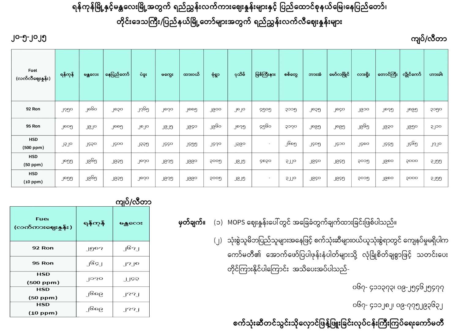 ရန်ကုန်မြို့နှင့် မန္တလေးမြို့အတွက် ရည်ညွှန်းလက်ကားဈေးနှုန်းများနှင့် ပြည်ထောင်စုနယ်မြေ နေပြည်တော်၊ တိုင်းဒေသကြီး/ပြည်နယ် မြို့တော်များအတွက် ရည်ညွှန်းလက်လီဈေးနှုန်းများ 05/20/2025