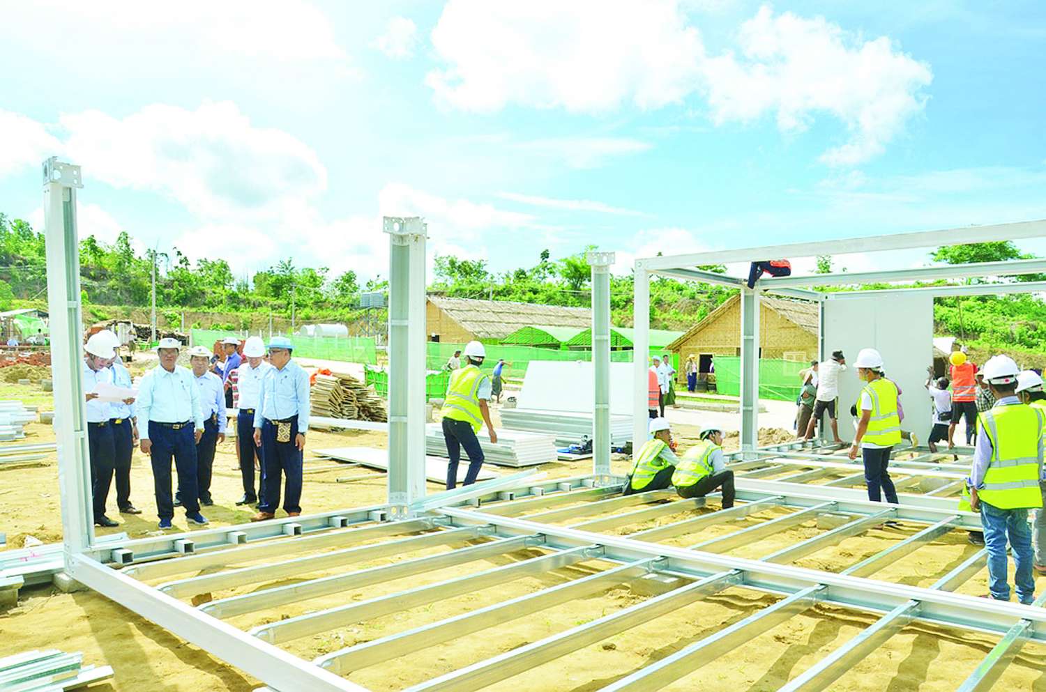 ထို့နောက် ပြည်ထောင်စု ဝန်ကြီးနှင့် တာဝန်ရှိသူများသည် ပေ (၂၀ x ၂၀) အရွယ်အစားရှိ Container House များ တည် ဆောက်နိုင်ရန်ပစ္စည်းများ ရောက်ရှိမှု၊ တပ်ဆင်တည်ဆောက်နေမှု၊ Footing Block များ ဆောင်ရွက်ပြီးစီးမှု၊ ပေ (၂၀ x ၁၂၀ ) အရွယ်အစားရှိ Modular (prefabrica-ted) house နှစ်ထပ်အဆောက် အအုံများ တည်ဆောက်နိုင်ရန် ဖောင်ဒေးရှင်းလုပ်ငန်းများ ဆောင်ရွက်ပြီးစီးမှု၊ ရေရရှိရေး၊ မီးရရှိရေး၊ မီးဖိုဆောင်နှင့် သန့်စင်ခန်းများ တည်ဆောက်နိုင်ရေး ဆောင်ရွက် နေမှုအခြေအနေတို့ကို အသေးစိတ်လိုက်လံကြည့်ရှုစစ်ဆေးပြီး ငလျင်ဘေးသင့်ဝန်ထမ်းများနှင့် ဝန်ထမ်းမိသားစုများ ရေ၊ မီး၊ မိလ္လာ အဆင်ပြေစွာ သုံးစွဲနိုင်ရန်နှင့် လုံခြုံစွာ နေထိုင်နိုင်ရန်အတွက် တပ်ဆင်တည်ဆောက်ခြင်းလုပ်ငန်းများ အမြန်ပြီးစီးနိုင်ရေး စီမံဆောင်ရွက်သွားရန်၊ ရေစီး ရေလာကောင်းမွန်စေရေးအတွက် ရေမြောင်းများအား တစ်ပါတည်းဆောင်ရွက်သွားရန်နှင့် ဝန်ထမ်းနှင့် ဝန်ထမ်းမိသားစုများအား ယာယီနေထိုင်သည့် ရွက်ဖျင်တဲများမှ တပ်ဆင်တည်ဆောက်ပြီးစီးသည့် Container House များအတွင်း အမြန်နေရာချထားနိုင်ရေး စီမံဆောင်ရွက်သွားရန် မှာကြားပြီး လိုအပ်သည်များ ဖြည့်ဆည်းဆောင်ရွက်ပေးသည်။