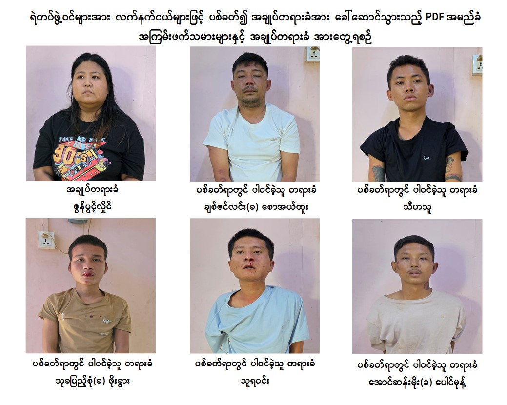 ရန်ကုန်တိုင်းဒေသကြီး၊ လှိုင်သာယာ(အရှေ့ပိုင်း)မြို့မရဲစခန်း၌ အကြမ်းဖက်မှုတိုက်ဖျက်ရေးဥပဒေပုဒ်မ ၅၀(ည)ဖြင့် ဖမ်းဆီးထားသည့် အချုပ်တရားခံ ဇွန်ပွင့်လှိုင်(၃၀)နှစ်၊ (ဘ) ဦးလှမင်းအား ရဲတပ်ဖွဲ့မှ လုံခြုံရေးတာဝန်ရှိသူများက၂၀၂၅ ခုနှစ်၊ ဇူလိုင် ၁ ရက် ညပိုင်းတွင် ကျောက်ကပ်ရောဂါအရေးပေါ်ကုသရန် အမှတ်(၅)ရပ်ကွက်၊ ဗိုလ်ချုပ်လမ်းရှိ သပြေအထူးကုဆေးခန်းသို့ ပို့ဆောင်ပေးပြီးအပြန် လှိုင်သာယာ(အရှေ့ပိုင်း)မြို့နယ်ရှိ Ocean Center သို့ ဝင်ရောက်ဆေးဝယ်ကာ ပြန်ထွက်လာစဉ် ကားပါကင်အနီးသို့အရောက်၌ PDF အမည်ခံ အကြမ်းဖက်သမားများက လက်နက်ငယ်များဖြင့် စောင့်ကြိုပစ်ခတ်ခဲ့ရာ ဆေးခန်းသို့လိုက်ပါပို့ဆောင်သည့် ရဲတပ်ဖွဲ့ဝင်များအား လက်နက်ငယ်ကျည်များထိမှန်၍ ထိခိုက်မှုများဖြစ်ပေါ်ခဲ့ပြီး အချုပ်တရားခံ ဇွန်ပွင့်လှိုင်အား ခေါ်ဆောင်ထွက်ပြေးသွားကြောင်း သိရှိရသည်။