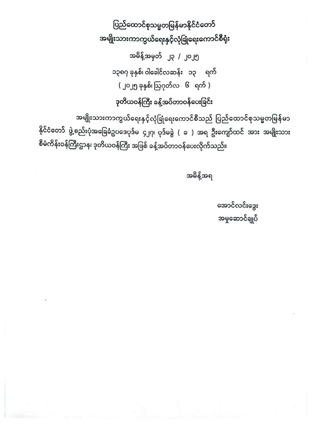 ဒုတိယဝန်ကြီး ခန့်အပ်တာဝန်ပေးခြင်း