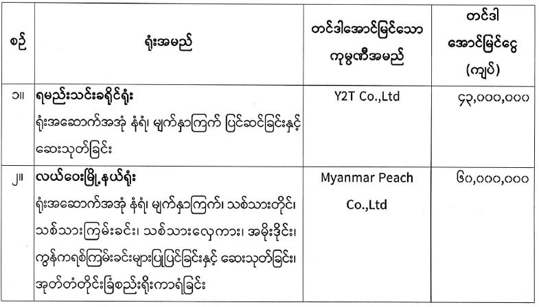 ပြန်ကြားရေးဝန်ကြီးဌာန၊ ပြန်ကြားရေးနှင့်ပြည်သူ့ဆက်ဆံရေးဦးစီးဌာန၏ ၂၀၂၅-၂၀၂၆ ဘဏ္ဍာရေးနှစ် ငွေလုံးငွေရင်းအသုံးစရိတ်ဖြင့် မန္တလေးငလျင်ကြီးကြောင့် ထိခိုက်ပျက်စီးခဲ့သည့် ရမည်းသင်းခရိုင်ရုံးနှင့် လယ်ဝေးမြို့နယ်ရုံး အဆောက်အအုံများ ပြင်ဆင်နိုင်ရေးအတွက် ၁၄-၈-၂၀၂၅ ရက်နေ့၌ ပြန်ကြားရေးဝန်ကြီးဌာန၊ ဝန်ကြီးရုံး စုပေါင်းခန်းမတွင် တင်ဒါကော်မတီ၏ စျေးနှုန်းစိစစ်ချက်အရလည်းကောင်း၊ ၁-၉-၂၀၂၅ ရက်နေ့တွင် ကျင်းပပြုလုပ်သော ပြန်ကြားရေးဝန်ကြီးဌာန၊ စီမံခန့်ခွဲရေးကော်မတီအစည်းအဝေးအမှတ်စဉ် (၁၂/ ၂၀၂၅)၏ သဘောတူညီချက်အရလည်းကောင်း အောက်ဖော်ပြပါကုမ္ပဏီများမှ ယှဉ်တွဲပါ ဈေးနှုန်းဖြင့် တင်ဒါအောင်မြင်ကြောင်း ကြေညာအပ်ပါသည်-