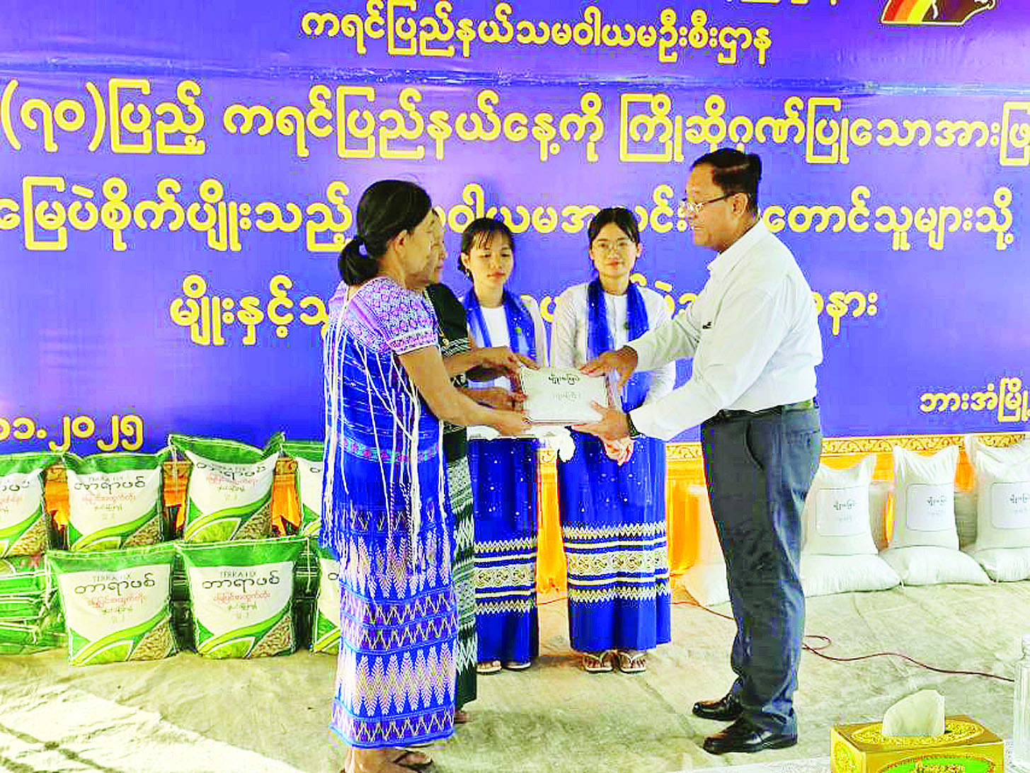 နှစ် (၇၀) ပြည့် ကရင်ပြည်နယ်နေ့ကို ဂုဏ်ပြုသောအားဖြင့် သမဝါယမကဏ္ဍ ဆီထွက်သီးနှံ မြေပဲစိုက်ပျိုးရေးစီမံကိန်းတွင် ပါဝင်ဆောင်ရွက်လျက်ရှိသော အောင်သပြေလယ်ယာနှင့် အထွေထွေစီးပွားရေးသမဝါယမအသင်းမှ အသင်းသားတောင်သူများသို့ မြေပဲမျိုးနှင့် သွင်းအားစုပေးအပ်ပွဲကို ယနေ့နံနက်ပိုင်းက ကော့လှိုက်ကျေးရွာ၌ ကျင်းပသည်။