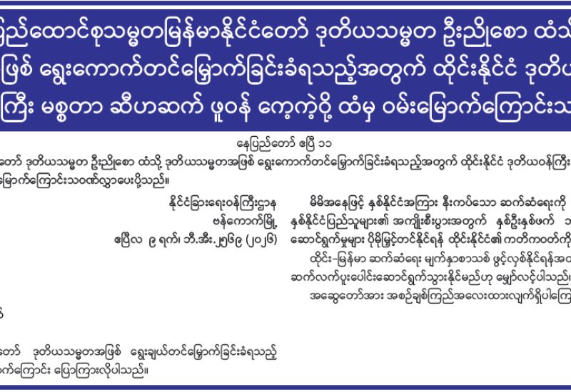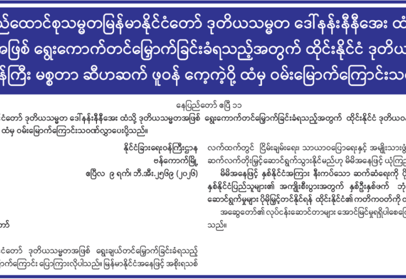 မျက်မှောက်ကာလတွင် ဖြစ်ပွားလျက်ရှိသော လုံခြုံရေး၊ တရားဥပဒေစိုးမိုးရေးနှင့် အကြမ်းဖက်မှုတားဆီးရေးဆိုင်ရာ ကိစ္စရပ်များနှင့် ပတ်သက်၍ ပရိသတ်များ၏ ရင်တွင်းခံစားချက် စကားသံများအား သဇင် FM ၏ ‘‘ပြည်သူ့ကြားကပြည်သူ့စကား’’ အစီအစဉ်မှ “အကြမ်းဖက် PDF အဖွဲ့ မိုင်းခွဲဖျက်ဆီးလိုက်တဲ့ ဧရာဝတီတံတား (ရတနာသိင်္ဂ)” ခေါင်းစဉ်ဖြင့် ၁၂-၁၁-၂၀၂၅ ရက် မွန်းလွဲ ၁ နာရီတွင် ထုတ်လွှင့်တင်ဆက်ပေးသွားမည်ဖြစ်ပါသည်။ လာမည့်အပတ် ၁၉-၁၁-၂၀၂၅ ရက် မွန်းလွဲ ၁ နာရီတွင် “တိုင်းပြည်လည်းနာရသလို ပြည်သူလည်းနာရတဲ့ အကြမ်းဖက်သမားတွေရဲ့ ဖောက်ခွဲဖျက်ဆီးသတ်ဖြတ်မှုများ” ခေါင်းစဉ်ဖြင့် ဆက်လက်ဆွေးနွေးတင်ဆက်မည်ဖြစ်ပါသည်။ အထက်ပါအစီအစဉ်အား အပတ်စဉ်ဆွေးနွေးတင်ဆက်မည်ဖြစ်သောကြောင့် ပါဝင်ဆွေးနွေးလိုသူပရိသတ်များအနေဖြင့် အပတ်စဉ် ကြာသပတေးနေ့တိုင်း နံနက် ၁၀ နာရီအချိန်မှ ၁၁ နာရီအတွင်း ဖုန်းနံပါတ် ၀၉-၈၉၉၀၉၉၅၈၅ သို့ အမည်၊ နေရပ်လိပ်စာ၊ အလုပ်အကိုင်နှင့် ပြန်လည်ဆက်သွယ်ရမည့် ဖုန်းနံပါတ်တို့ကို Message ပေးပို့ပါဝင်နိုင်ပြီဖြစ်ပါကြောင်းနှင့် ပါဝင်လာသည့်ပရိသတ်များ၏ ဖုန်းနံပါတ်များနှင့် ကိုယ်ရေးအချက်အလက်များအား လျှို့ဝှက်ပေးထားမည်ဖြစ်ကြောင်း အသိပေးကြေညာအပ်ပါသည်။