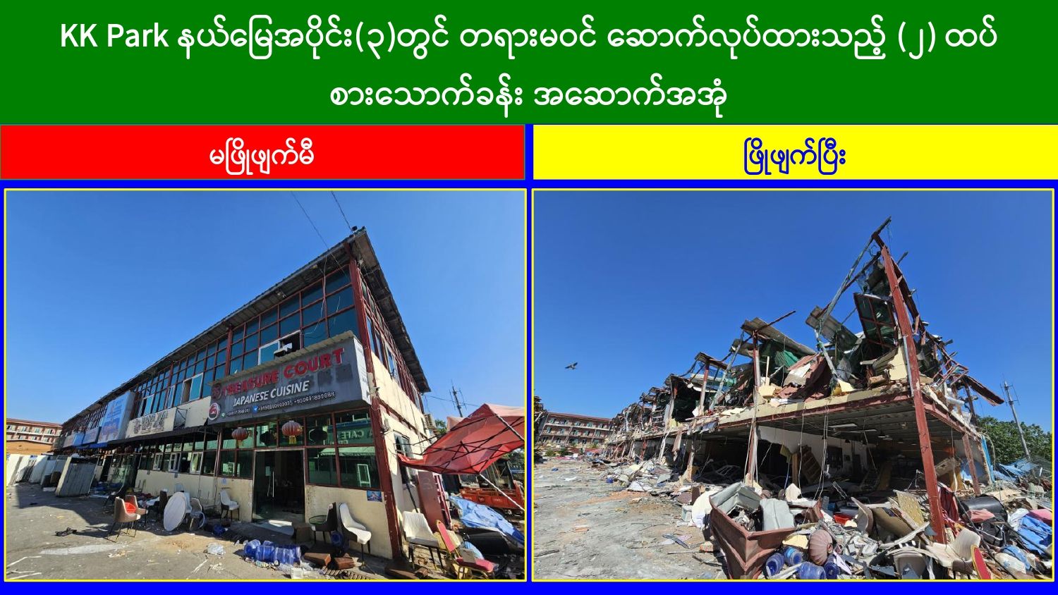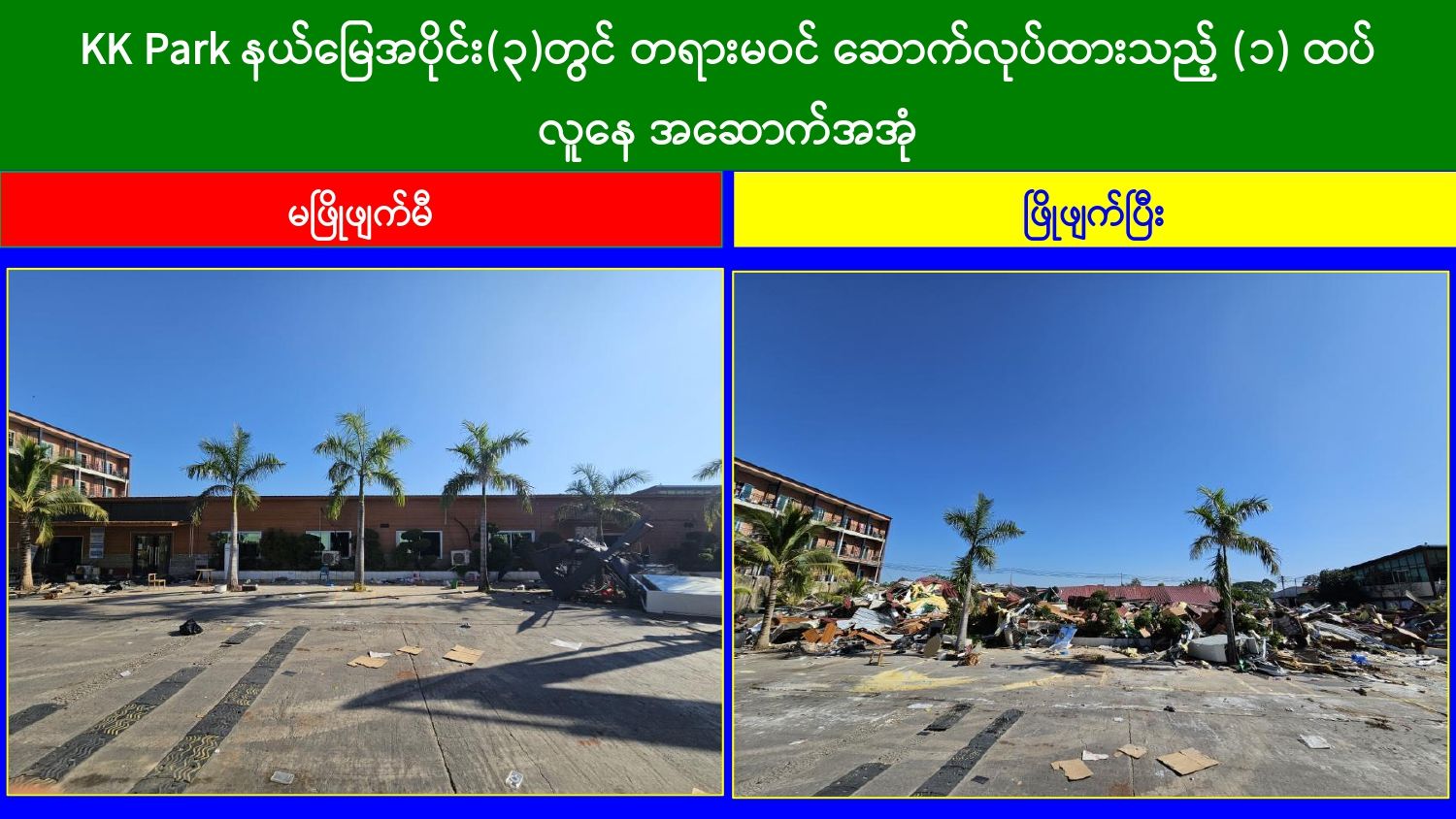ထိုသို့ဆောင်ရွက်လျက်ရှိရာ ယနေ့တွင် မြဝတီ-မဲထော်သလေး (KK Park) အပိုင်း (၃) နယ်မြေအတွင်းရှိ တရားမဝင်အဆောက်အအုံများဖြစ်သော ၁ ထပ် အဆောက်အုံ ၁ လုံး၊ ၂ ထပ်အဆောက်အအုံ ၄ လုံး၊ ၄ ထပ်အဆောက်အအုံ ၂ လုံး၊ စုစုပေါင်း တရားမဝင်အဆောက်အအုံ ၇ လုံးကို ထပ်မံဖြိုချဖျက်ဆီးခဲ့သဖြင့် အပိုင်း (၃) နယ်မြေအတွင်းရှိ အဆောက်အအုံ ၄၂၅ လုံးအနက် ယနေ့အထိ ၁၃၅ လုံး ဖြိုချဖျက်ဆီးခဲ့ကြောင်းနှင့် KK Park နယ်မြေအတွင်းရှိ တရားမဝင်အဆောက်အအုံ စုစုပေါင်း ၆၃၅ လုံး အနက် ၂၈၃ လုံးကို ဖြိုချဖျက်ဆီးပြီးဖြစ်ကြောင်း သိရှိရသည်။