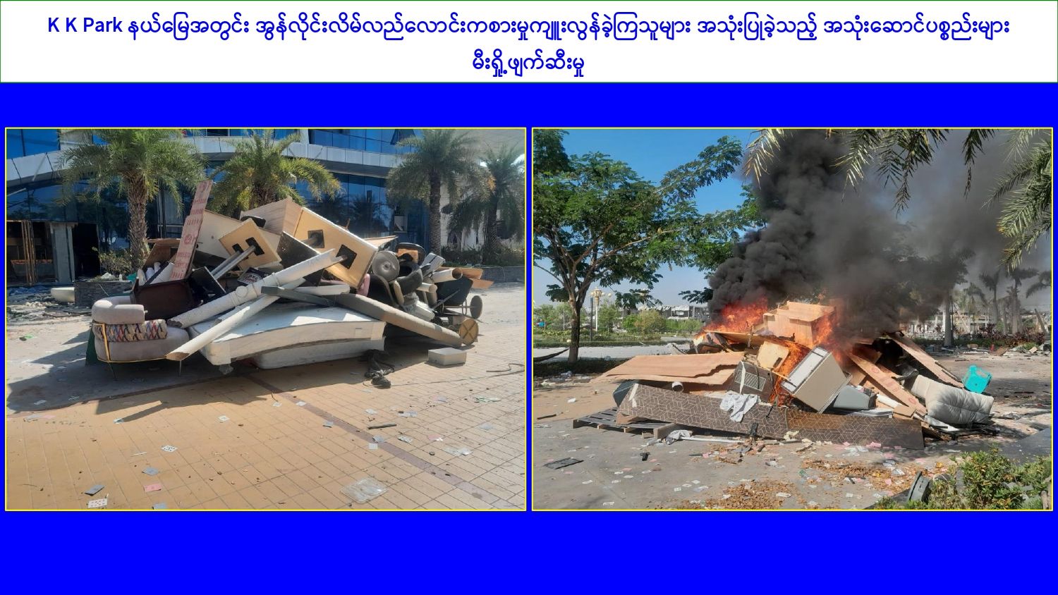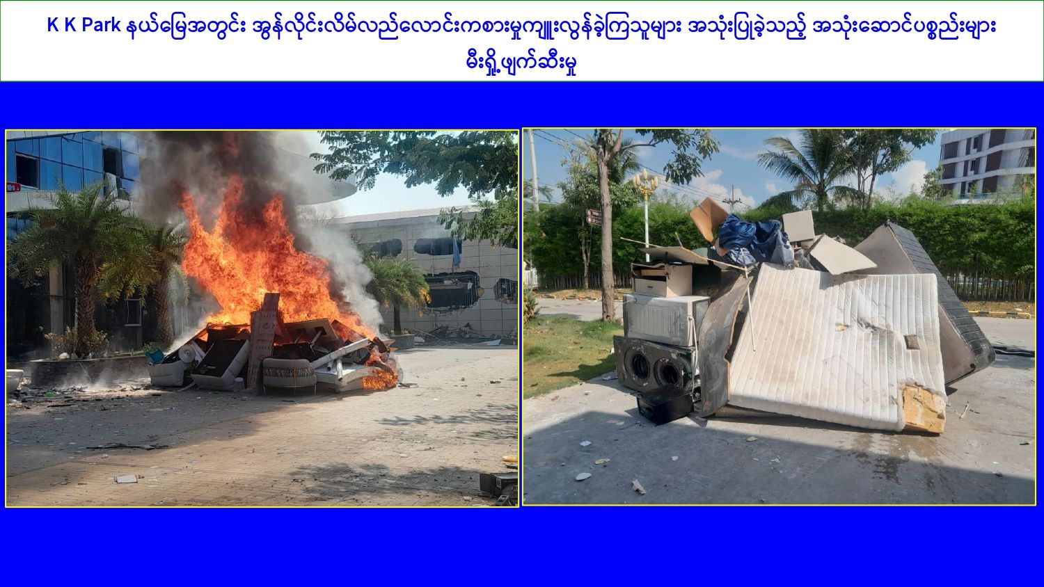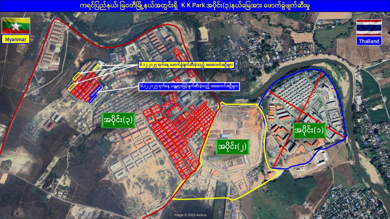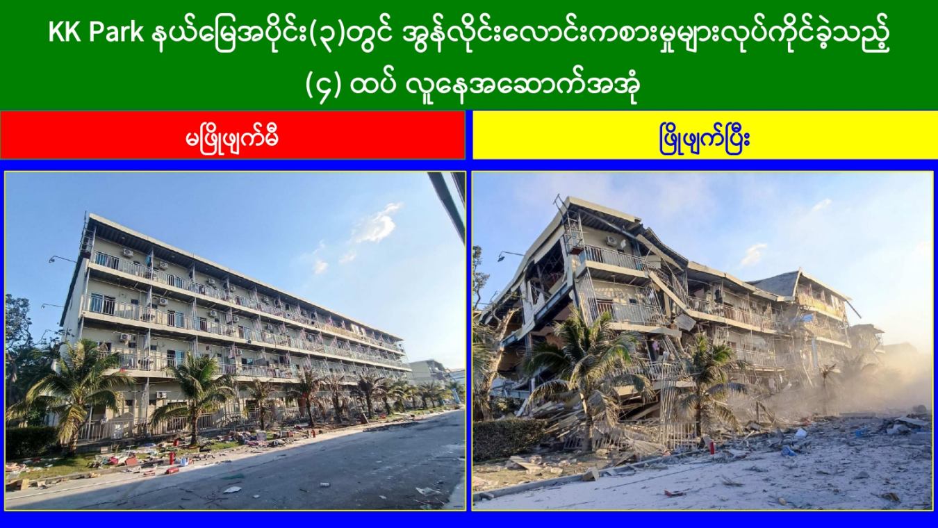 ၎င်းအပြင် မြဝတီမြို့နယ်အတွင်းရှိ KK Park နယ်မြေနှင့် ရွှေကုက္ကိုလ်နယ်မြေတို့၌ အွန်လိုင်းလိမ်လည်လောင်းကစားမှုကျူးလွန်ရာတွင် အသုံးပြုသည့်ပစ္စည်းများအား ထပ်မံ၍ အသုံးပြုနိုင်ခြင်းမရှိစေရန်အတွက်ယနေ့တွင်လည်း စနစ်တကျ မီးရှို့ဖျက်ဆီးခဲ့ကြောင်း သိရှိရသည်။