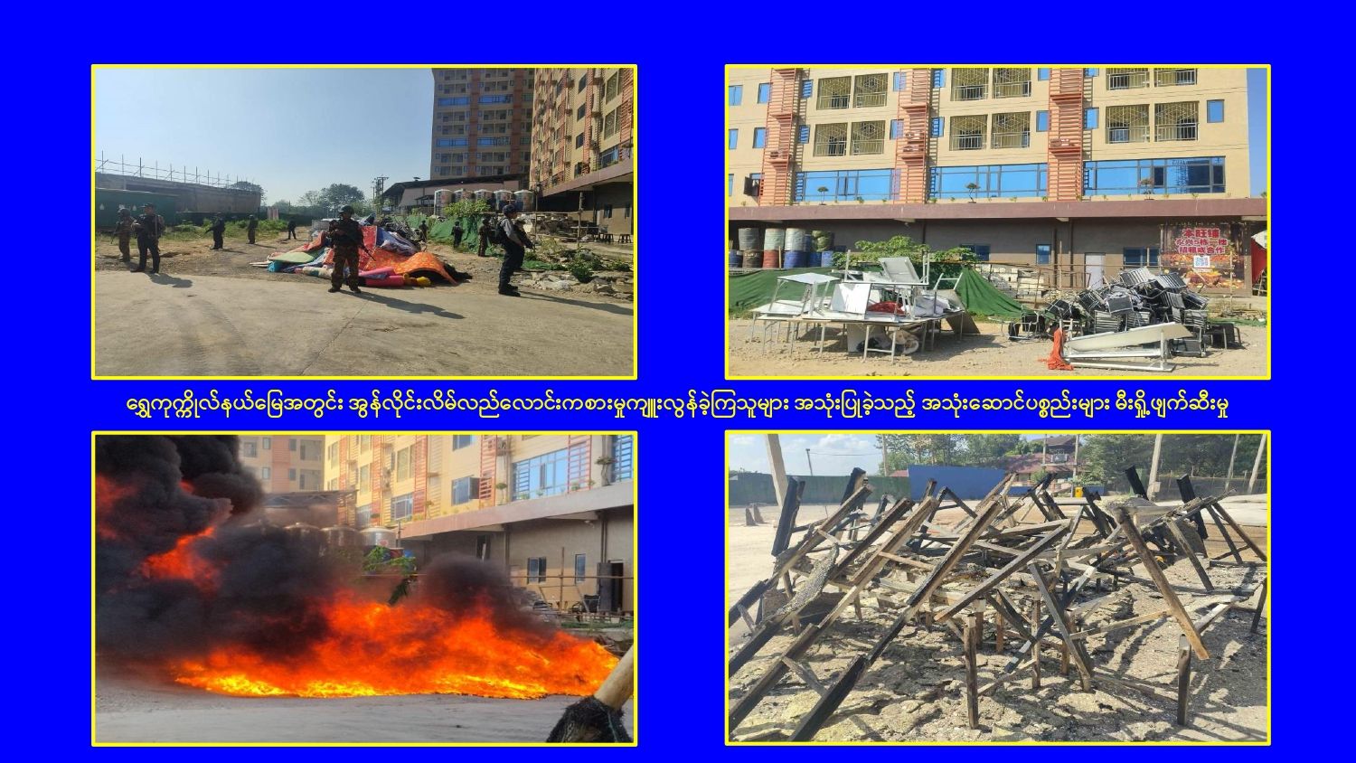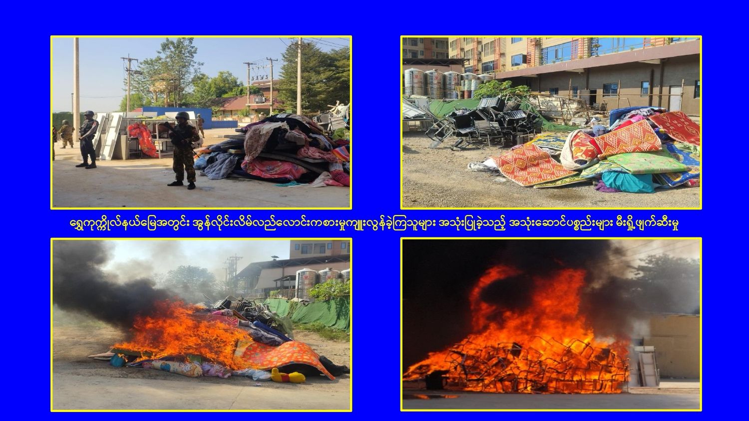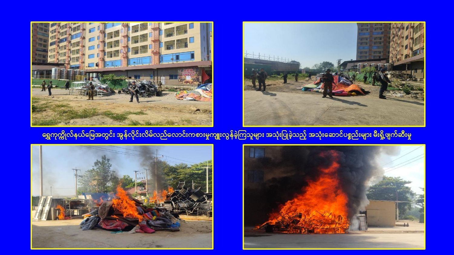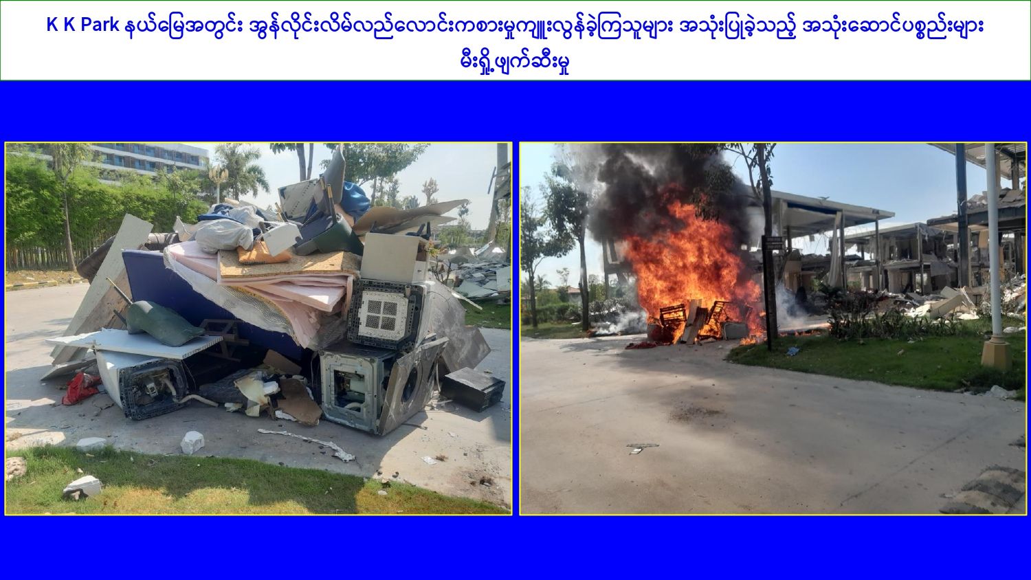 ၎င်းအပြင် မြဝတီမြို့နယ်အတွင်းရှိ KK Park နယ်မြေနှင့် ရွှေကုက္ကိုလ်နယ်မြေတို့၌ အွန်လိုင်းလိမ်လည်လောင်းကစားမှုကျူးလွန်ရာတွင် အသုံးပြုသည့်ပစ္စည်းများအား ထပ်မံ၍ အသုံးပြုနိုင်ခြင်းမရှိစေရန်အတွက်ယနေ့တွင်လည်း စနစ်တကျ မီးရှို့ဖျက်ဆီးခဲ့ကြောင်း သိရှိရသည်။