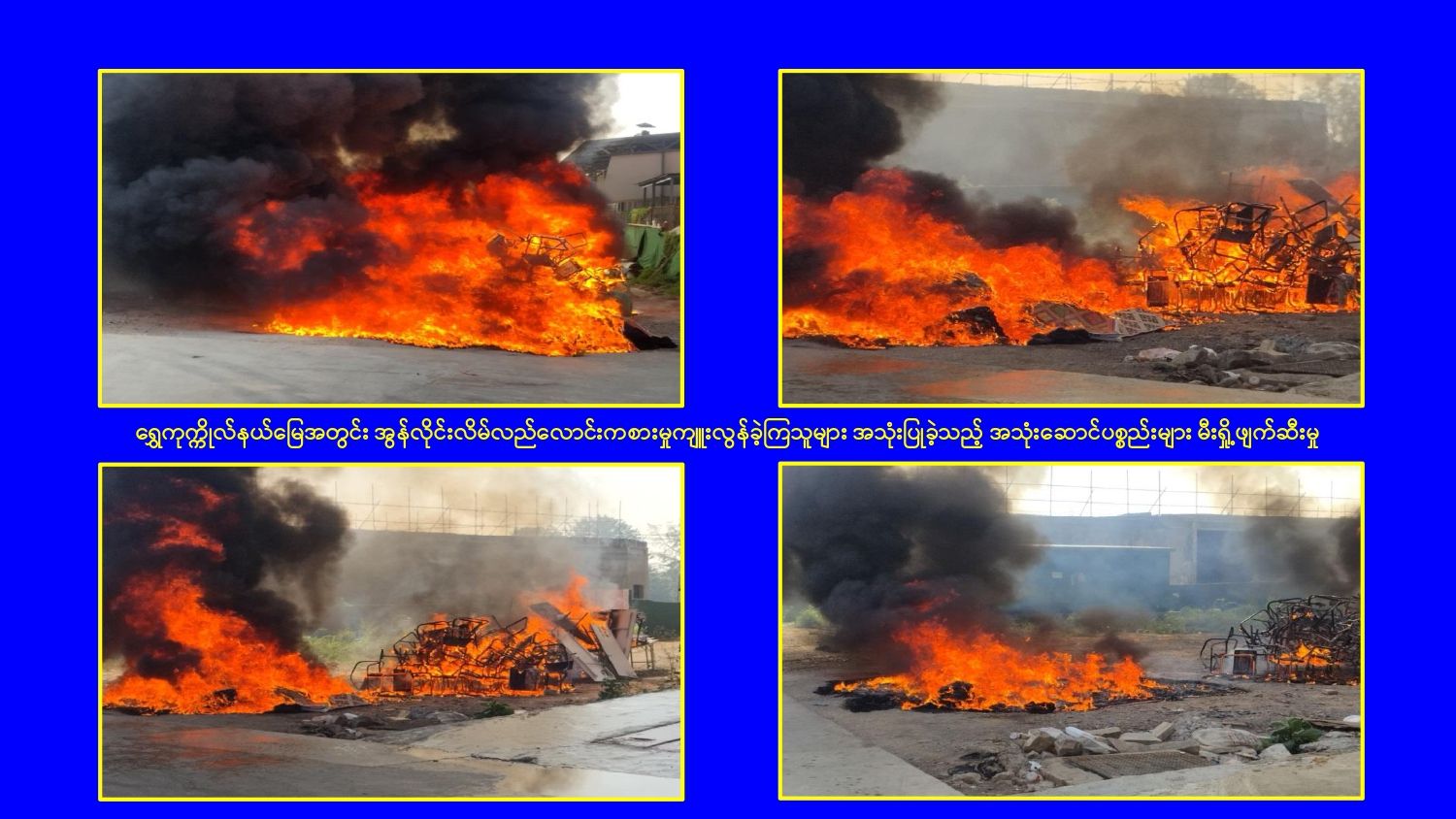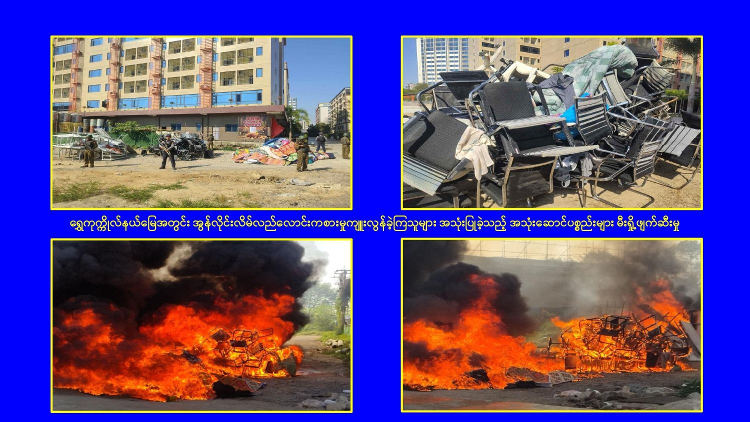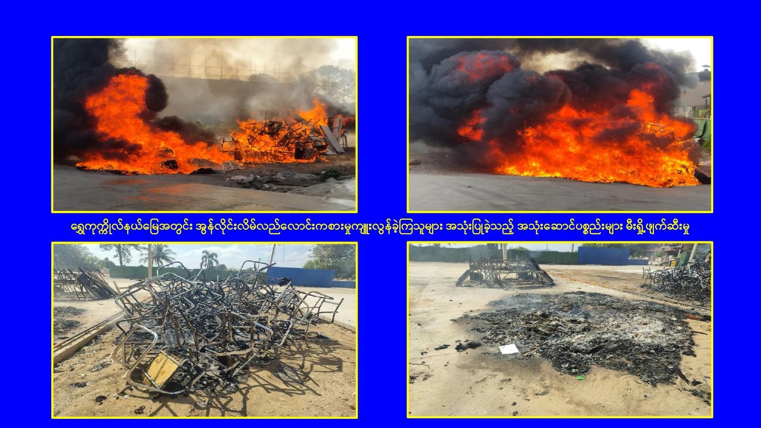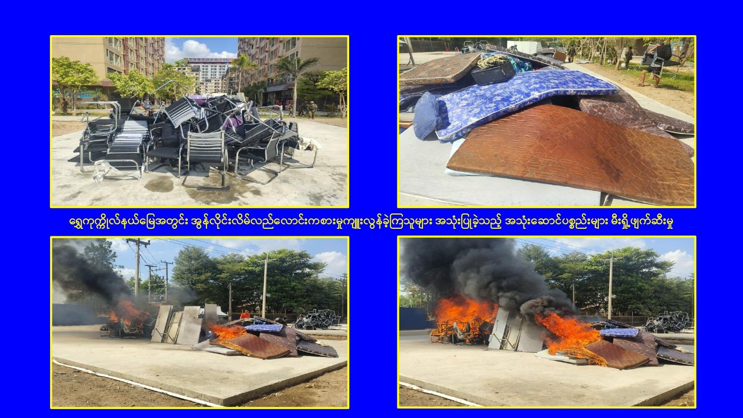 ၎င်းအပြင် မြဝတီမြို့နယ်အတွင်းရှိ KK Park နယ်မြေနှင့် ရွှေကုက္ကိုလ်နယ်မြေတို့၌ အွန်လိုင်းလိမ်လည်လောင်းကစားမှုကျူးလွန်ရာတွင် အသုံးပြုသည့်ပစ္စည်းများအား ထပ်မံ၍ အသုံးပြုနိုင်ခြင်းမရှိစေရန်အတွက်ယနေ့တွင်လည်း စနစ်တကျ မီးရှို့ဖျက်ဆီးခဲ့ကြောင်း သိရှိရသည်။