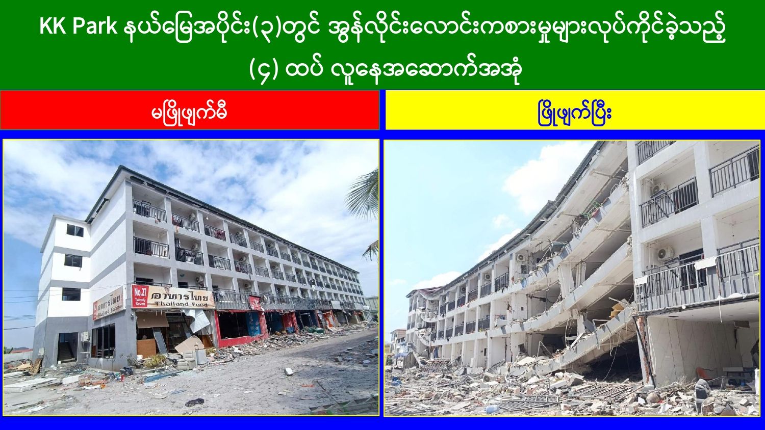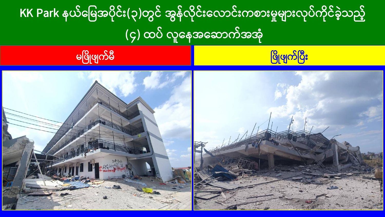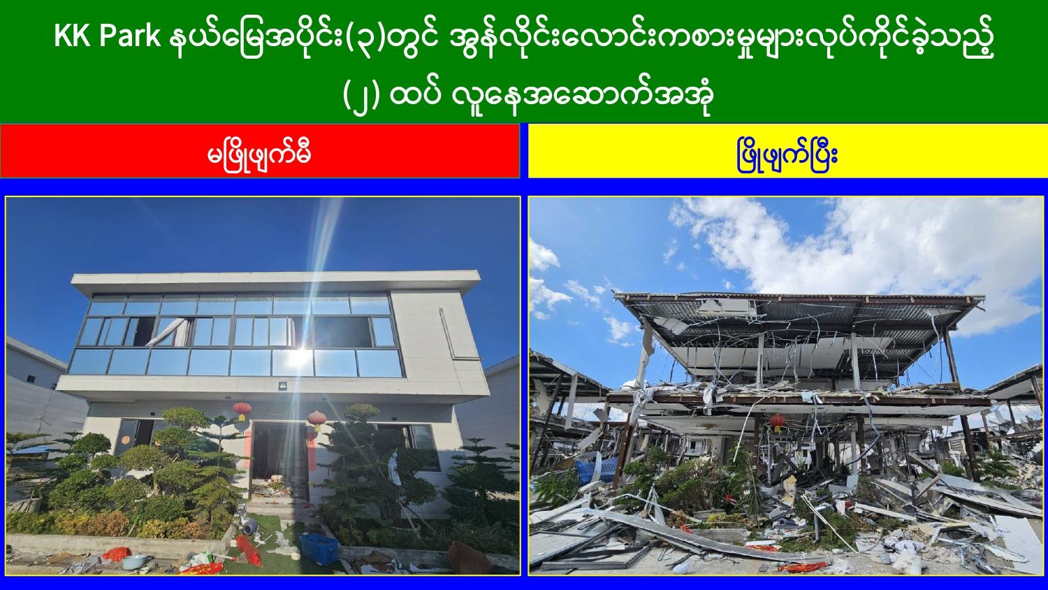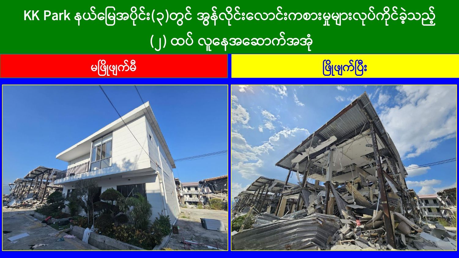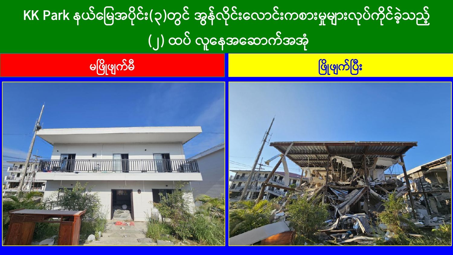 မြန်မာနိုင်ငံတော်အစိုးရအနေဖြင့် အွန်လိုင်းလိမ်လည်မှုများနှင့် အွန်လိုင်းလောင်းကစားမှုများ အများဆုံးအခြေချလုပ်ကိုင်လျက်ရှိကြသည့် ရွှေကုက္ကိုလ်နယ်မြေနှင့် မြဝတီ-မဲထော်သလေး (KK Park) နယ်မြေများ၌ လုံခြုံရေးတပ်ဖွဲ့ဝင်များ၊ အုပ်ချုပ်ရေးအဖွဲ့အစည်းများနှင့် ဒေသတွင်းတာဝန်ရှိသူများအပါအဝင် အဖွဲ့စုံပါဝင်သည့် ပူးပေါင်းအဖွဲ့ဖြင့် တရားမဝင်အဆောက်အအုံများအတွင်း ဝင်ရောက်ရှင်းလင်းခြင်း၊ အွန်လိုင်းလိမ်လည် လောင်းကစားမှုလုပ်ငန်းစဉ်များတွင်အသုံးပြုခဲ့သည့် သိမ်းဆည်းရမိပစ္စည်းများနှင့် တရားမဝင် အဆောက်အအုံများအား စနစ်တကျဖြိုချဖျက်ဆီးခြင်းနှင့် ချိပ်ပိတ်သိမ်းဆည်းခြင်းများ ဆောင်ရွက်လျက်ရှိရာ ယနေ့အထိ KK Park နယ်မြေအတွင်းရှိ တရားမဝင် အဆောက်အအုံ ၃၂၁ လုံးကို စနစ်တကျဖြိုချဖျက်ဆီးခဲ့ပြီး ရွှေကုက္ကိုလ်နယ်မြေအတွင်းရှိ အွန်လိုင်းလိမ်လည်လောင်းကစားမှုကျူးလွန်ရာတွင် အသုံးပြုသည့်ပစ္စည်းများအား ထပ်မံ၍ အသုံးပြုနိုင်ခြင်းမရှိစေရန်အတွက် စနစ်တကျ မီးရှို့ဖျက်ဆီးခဲ့ကြောင်း သိရှိရသည်။