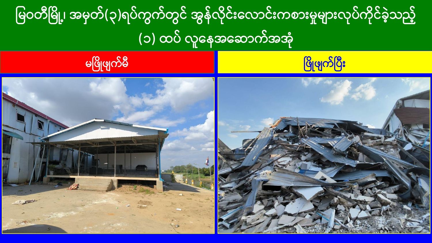 အွန်လိုင်းလောင်းကစားမှုများ၊ အွန်လိုင်းလိမ်လည်မှုများအပါအဝင် ဒုစရိုက်မှုများ ကျူးလွန်ခဲ့ကြသူများအား အင်တိုက်အားတိုက်ဖြင့် ကျယ်ကျယ်ပြန့်ပြန့်ရှာဖွေဖမ်းဆီး အရေးယူခြင်းများဆောင်ရွက်လျက်ရှိရာ ယနေ့တွင် မြဝတီမြို့ရှိ လုံခြုံရေးပူးပေါင်းအဖွဲ့များက သတင်းအရ မြဝတီမြို့ဝန်းကျင်တွင် ရှောင်တခင်စစ်ဆေးခြင်းများ ဆောင်ရွက်ခဲ့ရာ မဲထော်သလေးကျေးရွာအနီးတွင် တရားမဝင်အွန်လိုင်းလောင်းကစားမှုများ၊ အွန်လိုင်းလိမ်လည်မှုများ ကျူးလွန်ခဲ့ကြသည့် တရုတ်နိုင်ငံသား ၉၆ ဦးတို့အား ဖော်ထုတ်ဖမ်းဆီးရမိခဲ့သည်။ ထို့ပြင် မြဝတီမြို့၊ အမှတ်(၃)ရပ်ကွက်အတွင်းရှိ အွန်လိုင်းလိမ်လည်မှုနှင့် လောင်းကစားလုပ်ငန်းများလုပ်ကိုင်ရာတွင် အသုံးပြုနေထိုင်လုပ်ကိုင်ခဲ့ကြသည့် ၃ ထပ်အဆောက်အအုံ ၅ လုံး၊ ၁ ထပ် အဆောက်အအုံ ၃ လုံး၊ စုစုပေါင်း ၈ လုံးတို့အား စစ်ဆေးတွေ့ရှိခဲ့ရပြီး ၎င်းတို့အား ပြန်လည်အသုံးချမှုမရှိစေရေးအတွက် ဖြိုချဖျက်ဆီးခြင်းများကိုဆောင်ရွက်ခဲ့ရာ ယနေ့တွင်လည်း ၃ ထပ်အဆောက်အအုံ ၁ လုံး၊ ၁ ထပ်အဆောက်အအုံ ၂ လုံးကို ထပ်မံဖြိုချဖျက်ဆီးနိုင်ခဲ့သဖြင့် စုစုပေါင်း ၅ လုံး ဖြိုချဖျက်ဆီးပြီးဖြစ်ကြောင်း သိရှိရသည်။