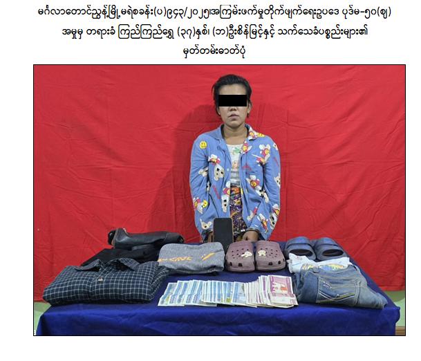 ဖြစ်စဉ်မှ အကြမ်းဖက်ဖောက်ခွဲဖျက်ဆီးသူများအား ဖမ်းဆီးရမိရေးအတွက် လုံခြုံရေးတပ်ဖွဲ့ဝင်များက စဉ်ဆက်မပြတ်စုံစမ်းဖော်ထုတ်ခဲ့ရာ အကြမ်းဖက်မှုကိုမလိုလားသည့် ပြည်သူများ၏ သတင်းပေးပို့ချက်အရ ပြစ်မှုကျူးလွန်သူ ဒဂုံမြို့သစ် (တောင်ပိုင်း) မြို့နယ်၊ (၁၀၅) ရပ်ကွက်၊ စွယ်တော်လမ်း၊ အမှတ် (၁၉၈) နေ ကြည်ကြည်ရွှေ (၃၇) နှစ် (ဘ) ဦးစိန်မြင့်နှင့် အခင်းဖြစ်ရပ်သို့ လိုက်ပါလာသည့် ၎င်း၏သားဖြစ်သူ မောင်လင်းလတ်ဟိန်း (ဘ) ဦးနိုင်လင်းတို့ ၂ ဦးအား ဒီဇင်ဘာလ ၂၄ ရက်နေ့ မွန်းလွဲ ၂ နာရီခွဲအချိန်တွင် ဗုံးဖောက်ခွဲရန် ခိုင်းစေသူကိုလင်း (ဖမ်းဆီးရန်ကျန်) မှ Kpay Account ဖြင့် ပေးအပ်သည့်ငွေ ၃၅၀,၀၀၀ ကျပ်မှ သုံးစွဲပြီးကျန်ငွေ ၂၄၅,၀၀၀၊ ဖုန်းအမှတ် ၀၉-၇၅၁၁၄၂၈၄၁ နှင့် ၀၉-၆၉၄၂၂၅၄၄၀ နံပါတ်ပါ itel P65 အမျိုးအစားလက်ကိုင်ဖုန်း ၁ လုံး၊ ပြစ်မှုကျူးလွန်စဉ်က ကြည်ကြည်ရွှေဝတ်ဆင်ခဲ့သည့် ရှပ်အင်္ကျီလက်ရှည် ၁ ထည်၊ အနက်ရောင်လက်တိုတီရှပ်အင်္ကျီ ၁ ထည်၊ CONVERSE စာတမ်းပါ ခဲရောင်ဘောင်းဘီအရှည် ၁ ထည်၊ XAVIER DANAUD စာတမ်းပါ အနက်ရောင်အမျိုးသမီးကိုင်ဘေးလွယ်အိတ် ၁ လုံး၊ ပန်းရောင်ကွင်းထိုးဖိနပ် ၁ ရံ၊ ပြစ်မှုကျူးလွန်စဉ်က မောင်လင်းလတ်ဟိန်းဝတ်ဆင်ခဲ့သည့် တီရှပ်အင်္ကျီလက်တို ၁ ထည်၊ ဂျင်းဘောင်းဘီအရှည် ၁ ထည်၊ ကွင်းထိုးအပြာရောင်ဖိနပ် ၁ ရံ တို့နှင့်အတူ ၎င်းတို့၏ နေအိမ်၌ ဖမ်းဆီးရမိခဲ့သဖြင့် မင်္ဂလာတောင်ညွန့်မြို့မရဲစခန်း (ပ) ၉၄၃/၂၀၂၅၊ အကြမ်းဖက်မှုတိုက်ဖျက်ရေး ဥပဒေပုဒ်မ ၅၀ (ဈ) ဖြင့် အမှုဖွင့်အရေးယူခဲ့သည်။