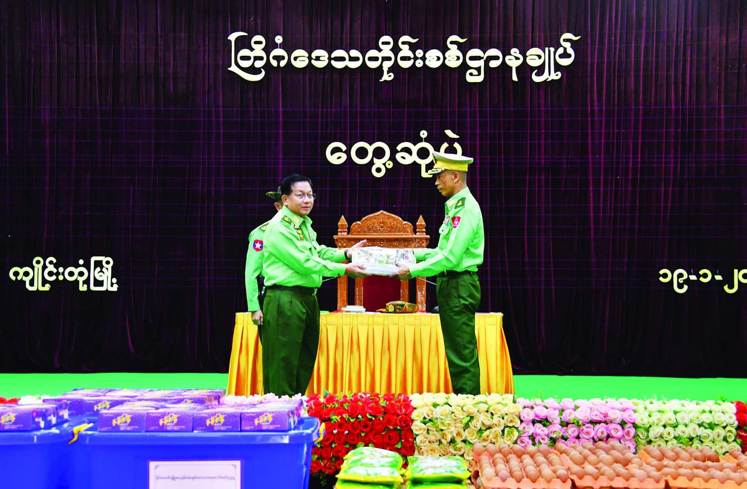 ထို့နောက် နိုင်ငံတော်လုံခြုံရေးနှင့်အေးချမ်းသာယာရေးကော်မရှင်ဥက္ကဋ္ဌ တပ်မတော်ကာကွယ်ရေးဦးစီးချုပ်က တပ်နယ်မှအရာရှိ၊ စစ်သည်၊ မိသားစုများအတွက် စားသောက်ဖွယ်ရာပစ္စည်းများကိုပေးအပ်ရာတိုင်းမှူးက လက်ခံရယူသည်။