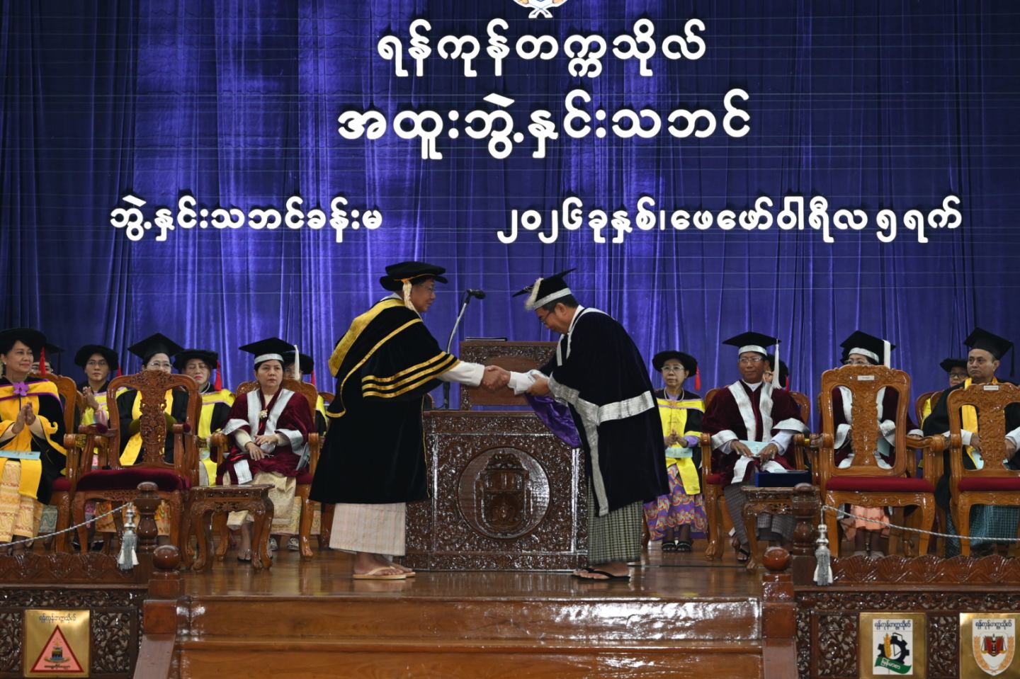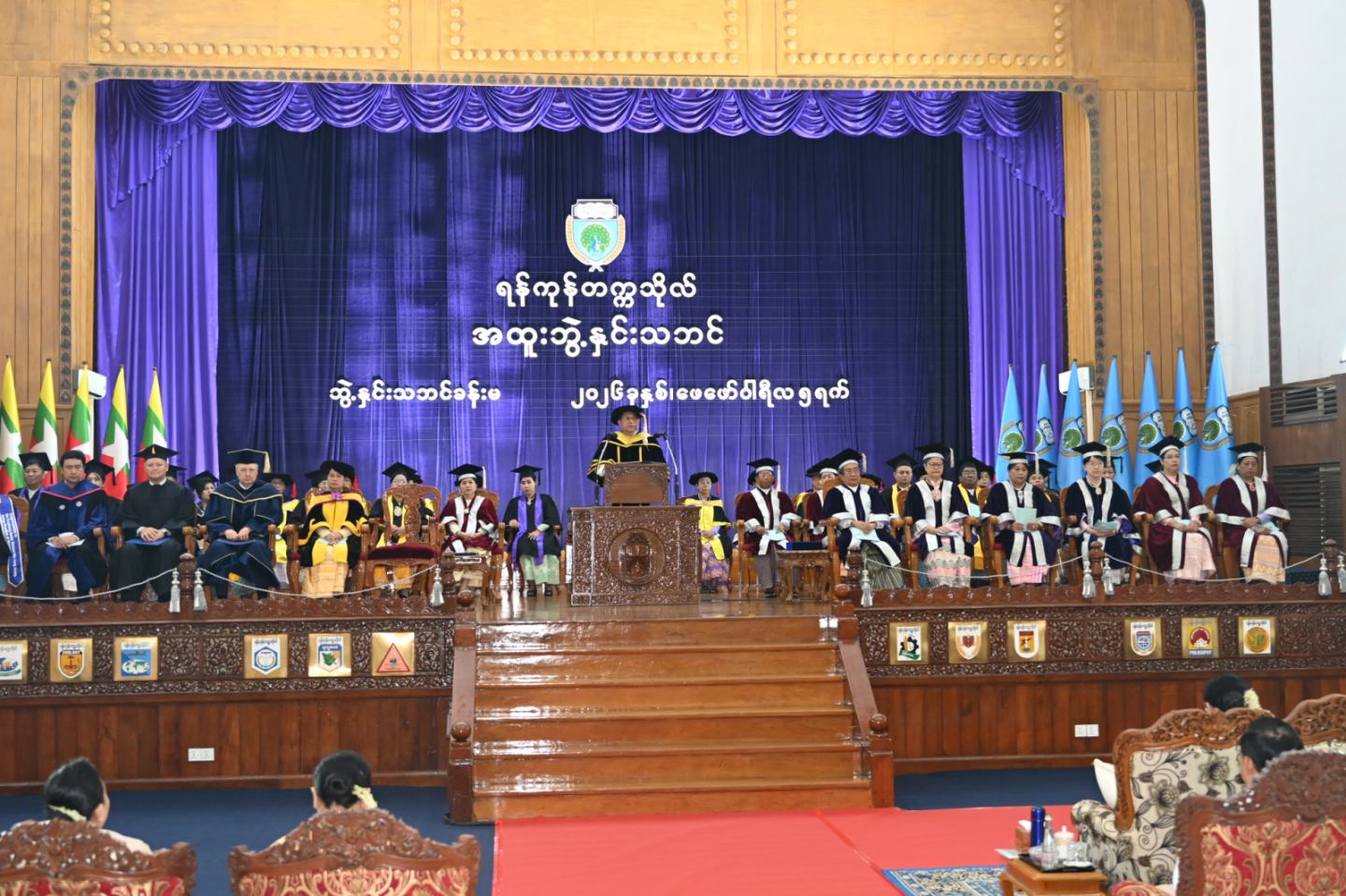 ၎င်းနောက် ရန်ကုန်တက္ကသိုလ်ပါမောက္ခချုပ်က ဘွဲ့နှင်းသဘင်မိန့်ခွန်းပြောကြားပြီး ဘွဲ့နှင်းသဘင်မိန့်ခွန်းကို မော်ကွန်းတိုက်တွင် ထိန်းသိမ်းရန် ရန်ကုန်တက္ကသိုလ်မော်ကွန်းထိန်းက ကြေညာသည်။