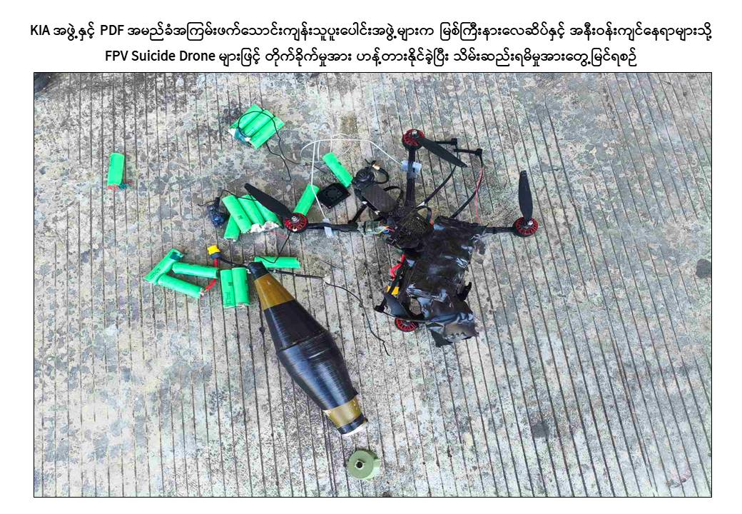 ထိုသို့ ဆောင်ရွက်လျက်ရှိရာ အကြမ်းဖက်သောင်းကျန်းသူပူးပေါင်းအဖွဲ့များက ယနေ့နံနက်ပိုင်းတွင် ကချင်ပြည်နယ်၊ မြစ်ကြီးနားမြို့၊ ပန်းမတီးရပ်ကွက်ရှိ မြစ်ကြီးနားလေဆိပ်နှင့် အနီးဝန်ကျင်နေရာများသို့ FPV Suicide Drone များအသုံးပြု၍ တိုက်ခိုက်ခဲ့ရာ လေကြောင်းလုံခြုံရေးတာဝန်များ ထမ်းဆောင်လျက်ရှိသည့် လုံခြုံရေးတပ်ဖွဲ့ဝင်များက လေကြောင်းရန်ကာကွယ်ရေးစနစ်များဖြင့် ထောက်လှမ်းသိရှိခဲ့ပြီး အဆိုပါ Drone ယာဉ်များအား လက်ဦးမှုရယူဟန့်တားနိုင်ခဲ့သည်။ ယင်းသို့ဆောင်ရွက်နိုင်ခဲ့ခြင်းကြောင့် လေဆိပ်အတွင်း ကျရောက်ပေါက်ကွဲခြင်းမရှိဘဲ လေယာဉ်ပြေးလမ်းနှင့် အနီးဝန်းကျင်နေရာများတွင်သာ မြေပြင်ပေါ်သို့ ပျက်ကျခဲ့ပြီး လုံခြုံရေးတပ်ဖွဲ့ဝင်များက အများပြည်သူများ အန္တရာယ်ကင်းရှင်းစေရန်အတွက် Drone ယာဉ်များတွင် ပါရှိသည့် ဖောက်ခွဲဖျက်ဆီးရေးပစ္စည်းများအား စနစ်တကျ သက်မဲ့ပြုလုပ်ခြင်းများ ဆောင်ရွက်ခဲ့သည်။ ဖြစ်စဉ်တွင် လူ၊ အဆောက်အအုံနှင့် လေယာဉ်ပြေးလမ်းများ ထိခိုက်ပျက်စီးမှုမရှိခဲ့ကြောင်း သိရှိရသည်။
