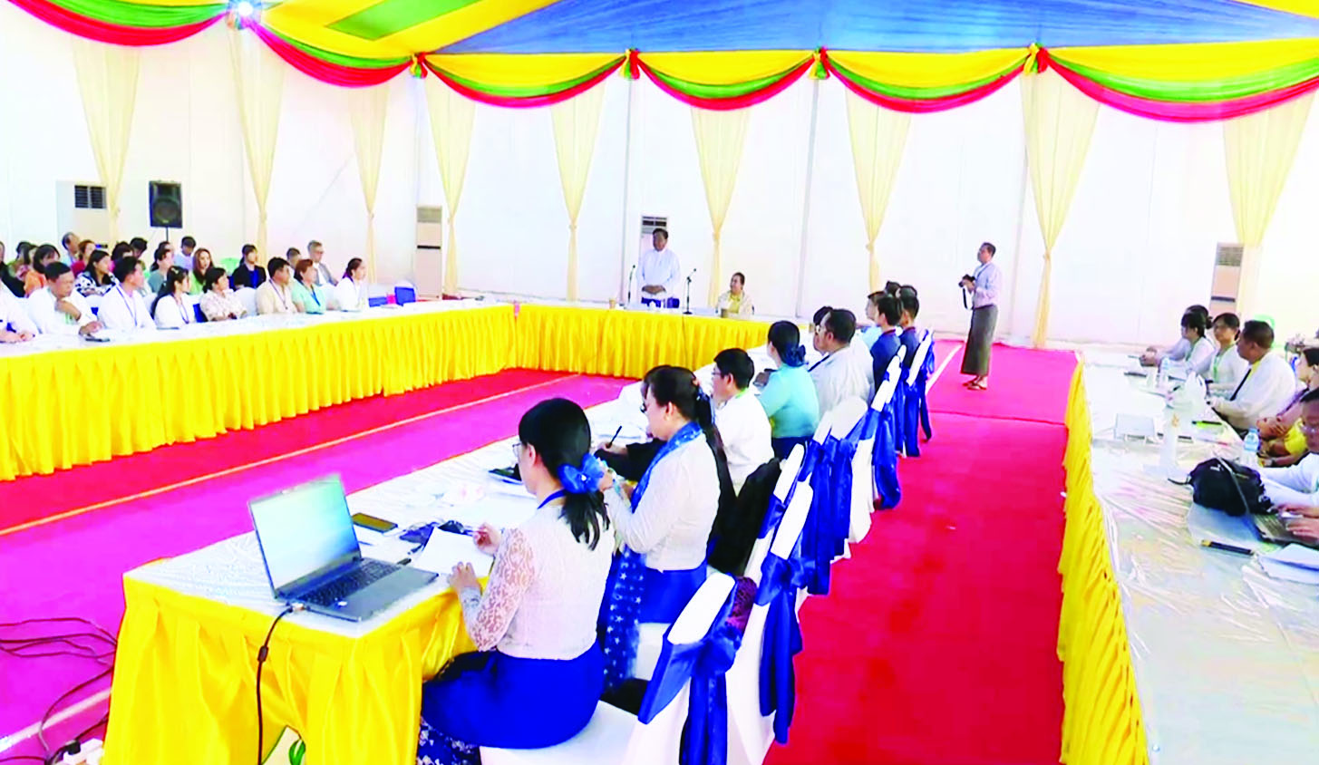 မွန်းလွဲပိုင်းတွင် MSME များ ရင်းနှီးမြှုပ်နှံမှုနှင့်လုပ်ငန်းများ ဖွံ့ဖြိုးတိုးတက်ရေးဆိုင်ရာ အသိပညာပေးရေး ဆွေးနွေးပွဲကို ဆက်လက်ကျင်းပရာ ရင်းနှီးမြှုပ်နှံမှုနှင့်နိုင်ငံခြားစီးပွားဆက်သွယ်ရေးဝန်ကြီးဌာန ပြည်ထောင်စုဝန်ကြီး ဒေါက်တာဝါဝါမောင်၊ စက်မှုဝန်ကြီးဌာန ပြည်ထောင်စုဝန်ကြီး ဒေါက်တာချာလီသန်း၊ ဌာနဆိုင်ရာတာဝန်ရှိသူများနှင့် လုပ်ငန်းရှင်များ တက်ရောက်ကြသည်။