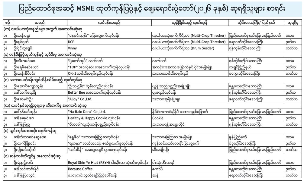 ပြည်ထောင်စုအဆင့် MSME ထုတ်ကုန်ပြပွဲနှင့် ဈေးရောင်းပွဲတော် ဆုချီးမြှင့်ခြင်းနှင့် ပိတ်ပွဲအခမ်းအနား ကျင်းပ