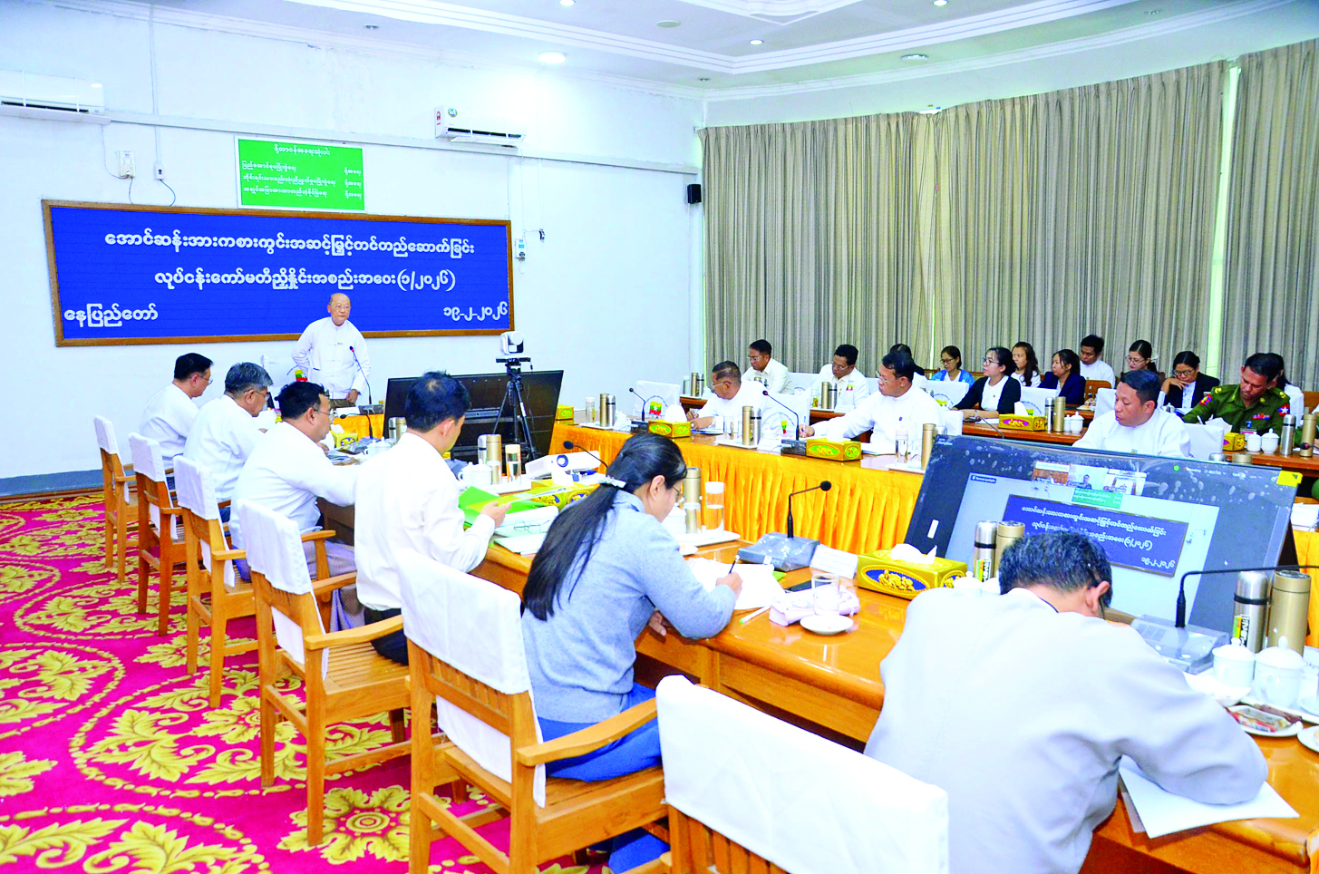 အလားတူ ယနေ့နံနက်ပိုင်းတွင် အောင်ဆန်းအားကစားကွင်း အဆင့်မြှင့်တင်တည်ဆောက်ခြင်း လုပ်ငန်းကော်မတီ ညှိနှိုင်းအစည်းအဝေးကို နေပြည်တော်ရှိ အားကစားနှင့်လူငယ်ရေးရာဝန်ကြီးဌာန အစည်းအဝေးခန်းမ၌ကျင်းပရာ ပြည်ထောင်စုဝန်ကြီး Jeng Phang နော်တောင်၊ ဒုတိယဝန်ကြီးများနှင့် တာဝန်ရှိသူများတက်ရောက်ကြပြီး ဆက်စပ်ဝန်ကြီးဌာနများမှ တာဝန်ရှိသူများက အွန်လိုင်းမှ တက်ရောက်ကြသည်။