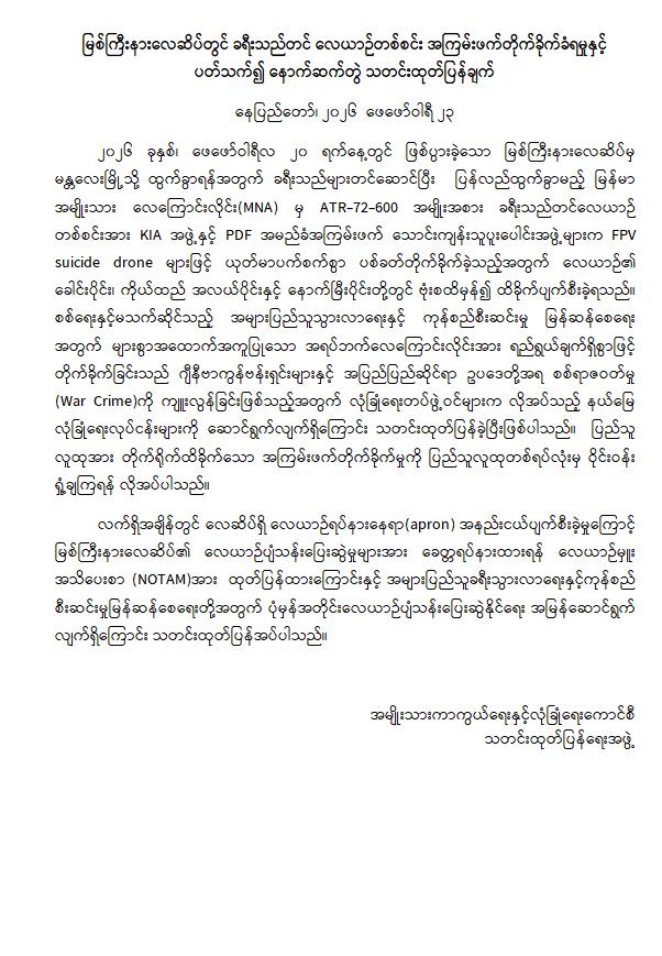 မြစ်ကြီးနားလေဆိပ်တွင် ခရီးသည်တင် လေယာဉ်တစ်စင်း အကြမ်းဖက်တိုက်ခိုက်ခံရမှုနှင့် ပတ်သက်၍ နောက်ဆက်တွဲ သတင်းထုတ်ပြန်ချက်
