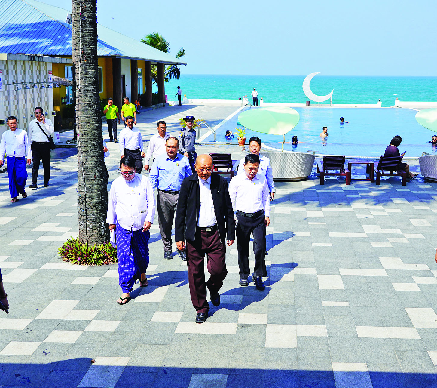 ယင်းနောက် ပြည်ထောင်စုဝန်ကြီးသည် ရွှေသောင်ယံကမ်းခြေဒေသ Sea & Lake အပန်းဖြေစခန်းနှင့် Mangrove View Resort Hotel ၌ အပန်းဖြေစခန်းအတွင်းရှိ ဒီရေတောစိုက်ခင်းများအား စနစ်တကျထိန်းသိမ်း၍ ခရီးသွားဆွဲဆောင်မှုတစ်ခုအနေဖြင့် စီစဉ်ဆောင်ရွက်ထားမှု၊ ခရီးသွားဧည့်သည်များအတွက် ဆောင်ရွက်ပေးလျက်ရှိသည့် ဝန်ဆောင်မှုများ၊ ကျောက်စိမ်းပြတိုက်၊ သစ်သားပန်းပုပြတိုက်များ ခင်းကျင်းပြသမှုနှင့် အမှတ်တရပစ္စည်းအရောင်းဆိုင်များ ဖွင့်လှစ်ထားရှိမှုကို ကြည့်ရှုကာ တာဝန်ရှိသူများအား လိုအပ်သည်များ မှာကြားသည်။