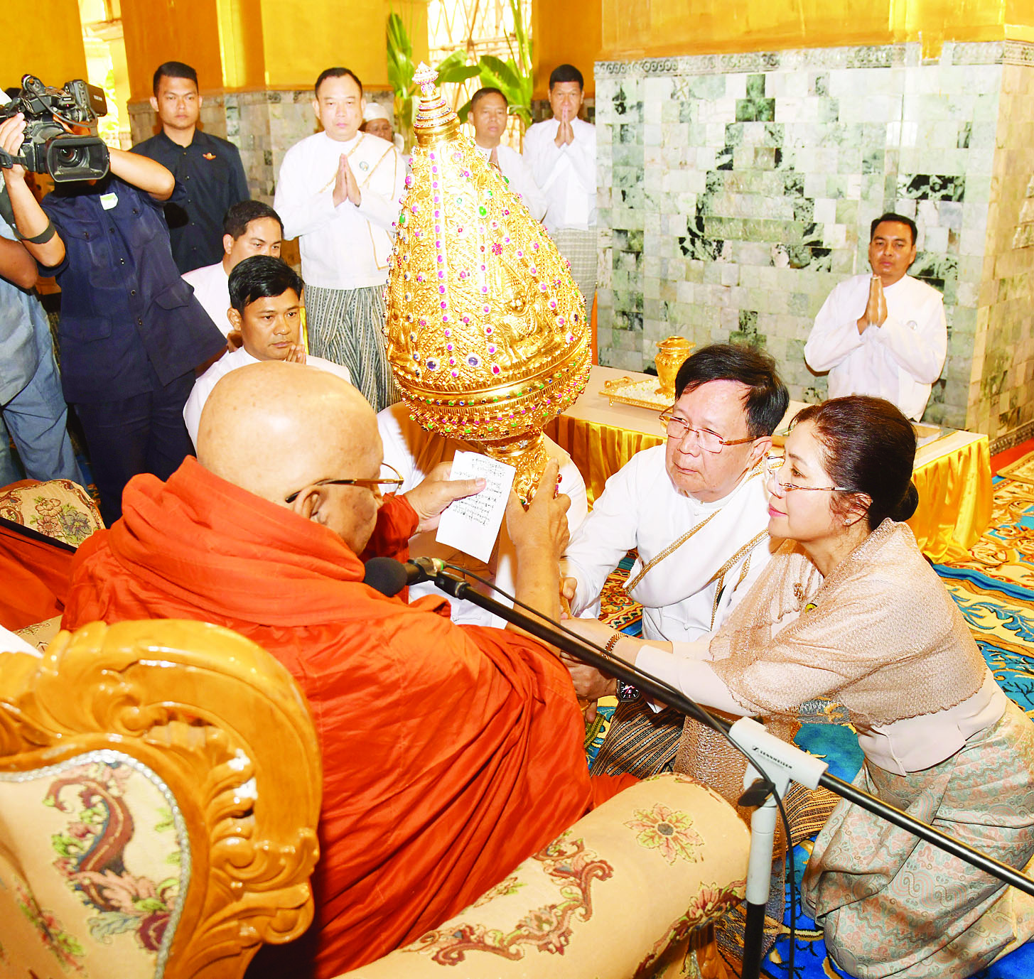 ယင်းနောက် ပြည်ထောင်စုဝန်ကြီးများက ငှက်မြတ်နားတော်နှင့် လှူဖွယ်ပစ္စည်းများအား သန်လျင်မင်းကျောင်း ဆရာတော်ကြီးထံ ဆက်ကပ်လှူဒါန်း ပူဇော်သည်။