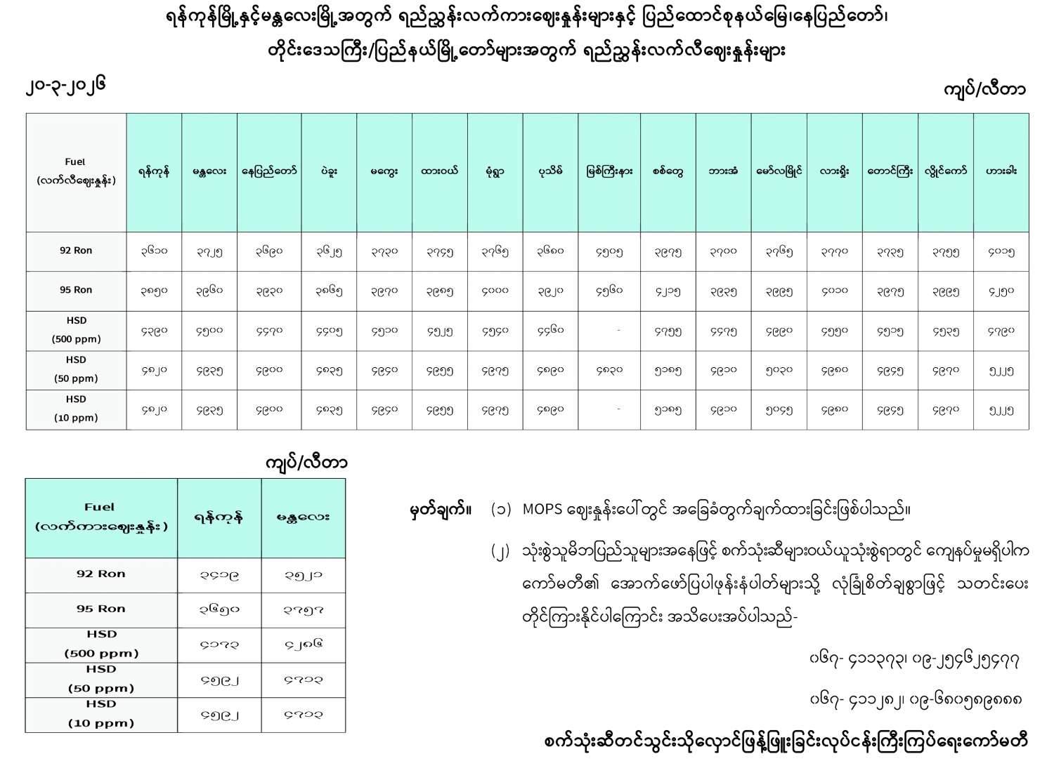 ရန်ကုန်မြို့နှင့် မန္တလေးမြို့အတွက် ရည်ညွှန်းလက်ကားဈေးနှုန်းများနှင့် ပြည်ထောင်စုနယ်မြေ နေပြည်တော်၊ တိုင်းဒေသကြီး/ပြည်နယ် မြို့တော်များအတွက် ရည်ညွှန်းလက်လီဈေးနှုန်းများ 03/20/2026