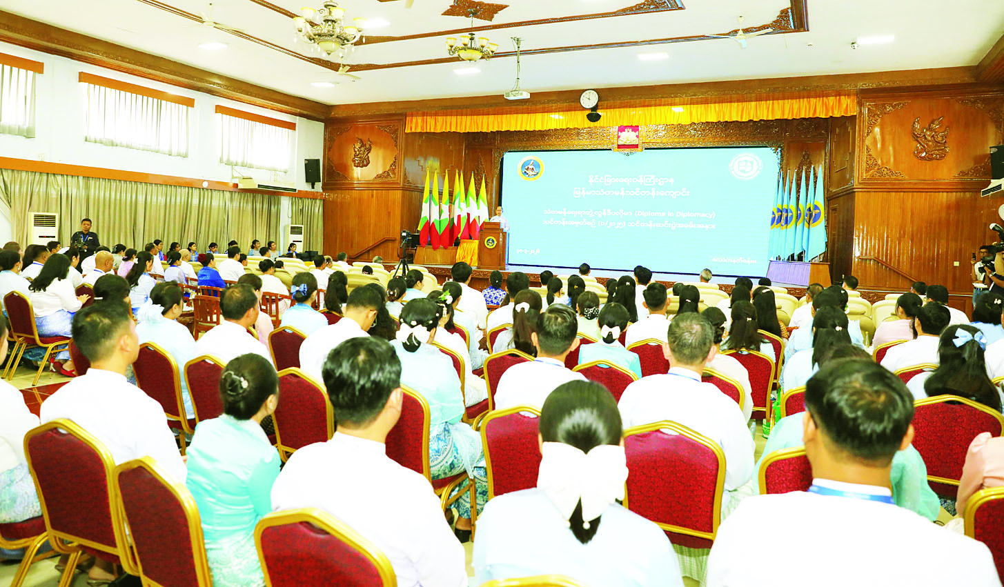 မြန်မာသံတမန်သင်တန်းကျောင်း သံတမန်ရေးရာ ဘွဲ့လွန်ဒီပလိုမာသင်တန်း အမှတ်စဉ် (၁/၂၀၂၅) သင်တန်းဆင်းပွဲကို ယနေ့နံနက် ၁၀ နာရီတွင် နိုင်ငံခြားရေးဝန်ကြီးဌာန နေပြည်တော်ရှိ လောကနတ်ခန်းမ၌ ကျင်းပသည်။