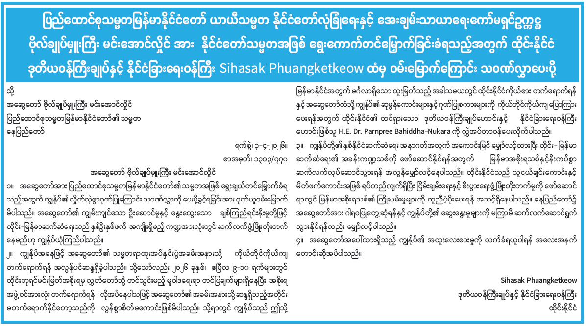 ပြည်ထောင်စုသမ္မတမြန်မာနိုင်ငံတော် ယာယီသမ္မတ နိုင်ငံတော်လုံခြုံရေးနှင့် အေးချမ်းသာယာရေးကော်မရှင်ဥက္ကဋ္ဌ ဗိုလ်ချုပ်မှူးကြီး မင်းအောင်လှိုင်အား နိုင်ငံတော်သမ္မတအဖြစ် ရွေးကောက်တင်မြှောက်ခြင်းခံရသည့်အတွက် ထိုင်းနိုင်ငံ ဒုတိယဝန်ကြီးချုပ်နှင့် နိုင်ငံခြားရေးဝန်ကြီး Sihasak Phuangketkeow ထံမှ ဝမ်းမြောက်ကြောင်း သဝဏ်လွှာပေးပို့