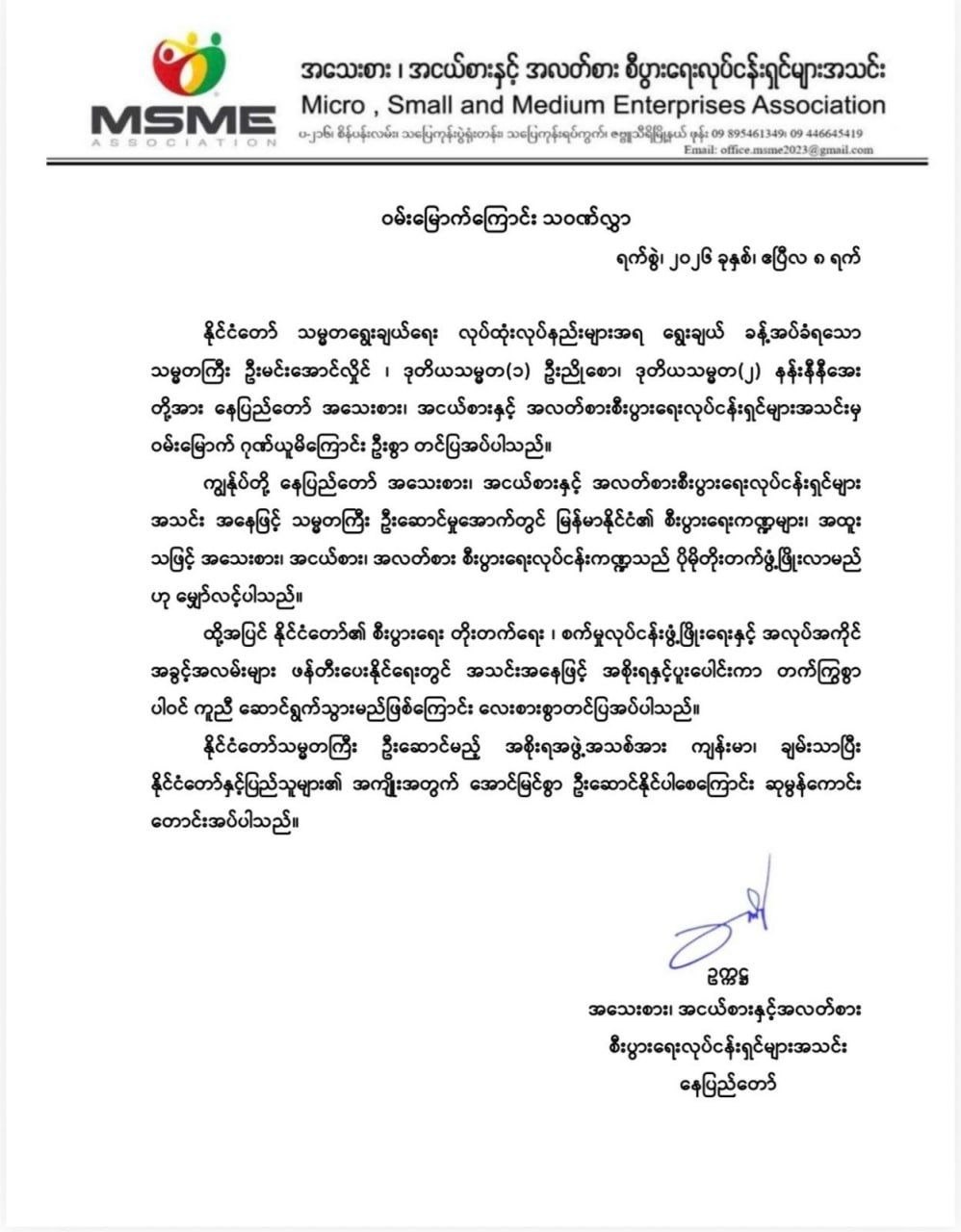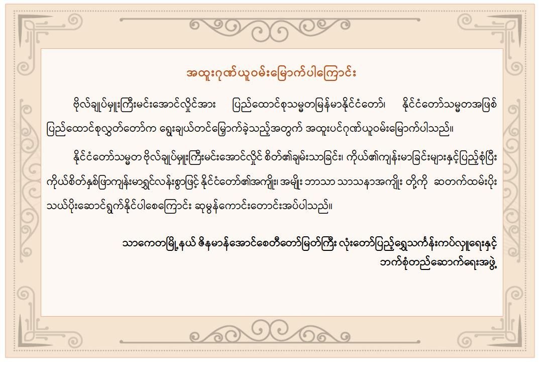 အဆိုပါ ထုတ်ပြန်ကြေညာချက်များတွင် ပြည်ထောင်စုသမ္မတမြန်မာနိုင်ငံတော် နိုင်ငံတော်သမ္မတအဖြစ် ဗိုလ်ချုပ်မှူးကြီးမင်းအောင်လှိုင်အား ပြည်ထောင်စုလွှတ်တော်က ရွေးချယ်တင်မြှောက်ခဲ့သည့်အတွက် အထူးလှိုက်လှဲစွာဂုဏ်ယူဝမ်းမြောက်ပါကြောင်း၊ နိုင်ငံတော်သမ္မတ ဗိုလ်ချုပ်မှူးကြီးမင်းအောင်လှိုင် စိတ်၏ချမ်းသာခြင်း၊ ကိုယ်၏ကျန်းမာခြင်းများနှင့်ပြည့်စုံပြီး ကိုယ်စိတ်နှစ်ဖြာကျန်းမာရွှင်လန်းစွာဖြင့် နိုင်ငံတော်၏ အကျိုး၊ အမျိုးဘာသာ သာသနာအကျိုးတို့ကို ဆတက်ထမ်းပိုး သယ်ပိုးဆောင်ရွက်နိုင်ပါစေကြောင်း၊ သမ္မကြီးဦးဆောင်မှုအောက်တွင် မြန်မာနိုင်ငံ၏ စီးပွားရေးကဏ္ဍများ၊ အထူးသဖြင့် အသေးစား၊ အငယ်စား၊ အလတ်စား စီးပွားရေးလုပ်ငန်းကဏ္ဍသည် ပိုမိုတိုးတက်ဖွံ့ဖြိုးလာမည်ဟု မျှော်လင့်ပါကြောင်း၊ ကျန်းမာခြင်းသုခနှင့် ပြည့်စုံပါစေ၊ ဘေးရန်အပေါင်းမှ ကင်းဝေးပါစေ၊ ကပ်ကြီးသုံးပါးမှ ကင်းဝေးပါစေကြောင်းစသည်ဖြင့် ပါရှိကြောင်း သိရှိရသည်။