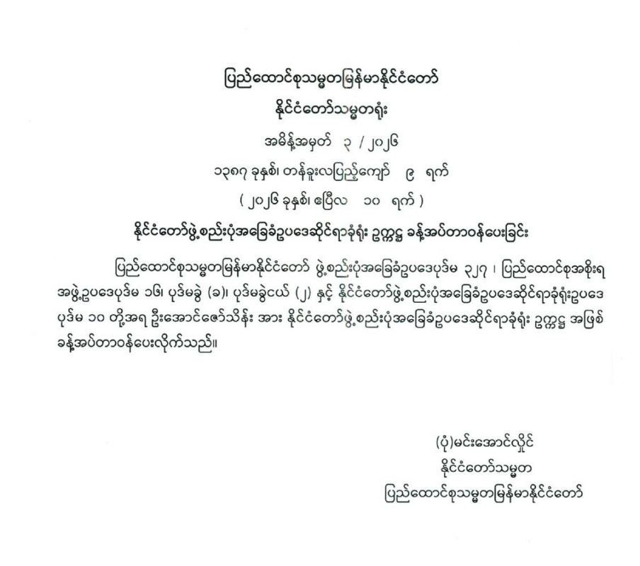 နိုင်ငံတော်ဖွဲစည်းပုံအခြေခံဥပဒေဆိုင်ရာခုံရုံးဥက္ကဋ္ဌ ခန့်အပ်တာဝန်ပေးခြင်း
