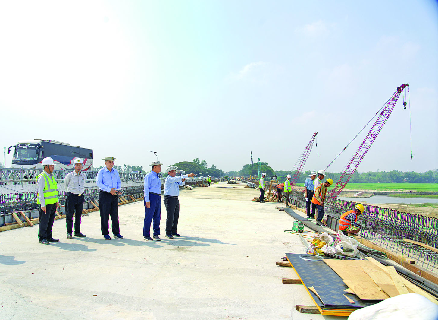 ထို့နောက် ပြည်ထောင်စုဝန်ကြီးနှင့်အဖွဲ့သည် တံတားလုပ်ငန်းခွင်သို့သွားရောက်၍ P-1 မှ P-9 အထိ Steel Plate Girder များ တပ်ဆင်ပြီးစီး၍ တံတားကြမ်းခင်း ကွန်ကရစ်သွန်းလောင်းခြင်း လုပ်ငန်းဆောင်ရွက်ပြီးစီးမှု၊ Bearing များအား ငလျင်ဒဏ်ခံ Elastomeric Bearings များ တပ်ဆင်ဆောင်ရွက်ထားသည့်အခြေအနေ၊ အရည်အသွေးထိန်းသိမ်းရေးဆောင်ရွက်နေမှု၊ ရေတိုက်စားမှုကာကွယ်ရန် ရေလမ်းကြောင်းရှင်းလင်းခြင်းနှင့် ရေတားအကာအကွယ်များ ဆောင်ရွက်ထားရှိမှုတို့ကို ကြည့်ရှုစစ်ဆေးပြီး တာဝန်ရှိသူများအား လုပ်ငန်းလိုအပ်ချက်များ မှာကြားသည်။
