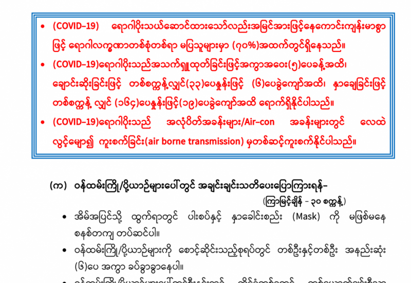 ရုံး/ဌာနများတွင် COVID-19 ရောဂါ ကူးစက်ပြန့်ပွားမှုမရှိစေရန် ကြီးကြပ်သူများ/ တာဝန်ကျဝန်ထမ်းများအနေဖြင့် အချင်းချင်း သတိပေးပြောကြားရမည့် အချက်များ