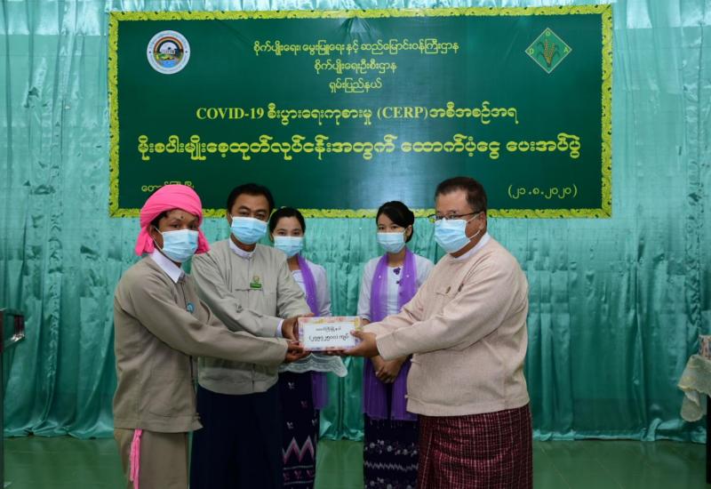 `COVID-19 စီးပွားရေးကုစားမှု (CERP)အစီအစဉ် အရ ရှမ်းပြည်နယ်၊တောင်ကြီးခရိုင် အတွင်းရှိ မိုးစပါးမျိုးစေ့ထုတ် လုပ်ငန်းအတွက် ထောက်ပံ့ငွေပေးအပ်ခြင်းကို ယနေ့ နံနက် ၁၀ နာရီအချိန် က တောင်ကြီးမြို့၊ ရှမ်းပြည်နယ်စိုက်ပျိုးရေးရုံး အစည်းအဝေးခန်းမ၌ ကျင်းပသည်။