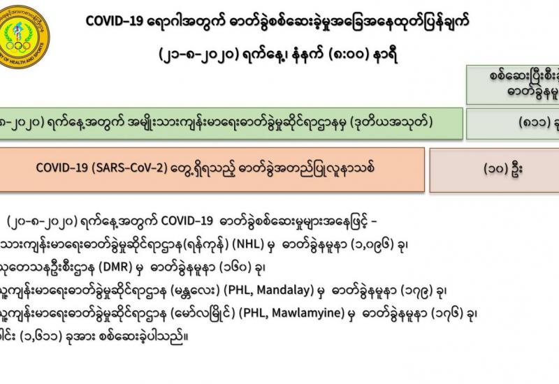 ၁။ (၂၀-၈-၂၀၂၀) ရက်နေ့အတွက် COVID-19 ရောဂါ ဓာတ်ခွဲစစ်ဆေးရာတွင် -