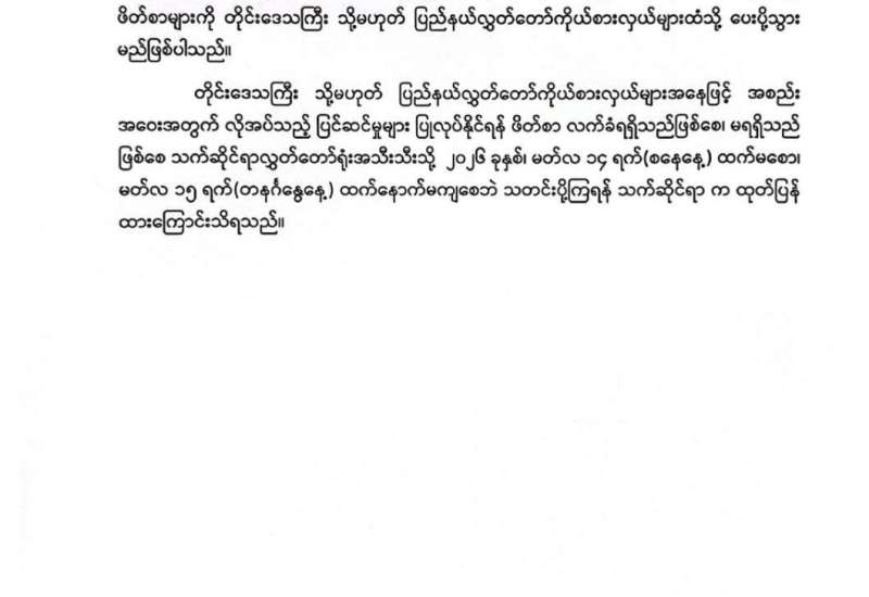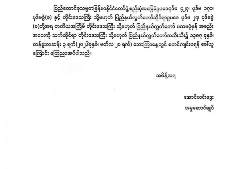 တတိယအကြိမ် တိုင်းဒေသကြီး သို့မဟုတ် ပြည်နယ်လွှတ်တော် ပထမပုံမှန်အစည်းအဝေးတက်ရောက်ရန်အတွက် လွှတ်တော်ကိုယ်စားလှယ်များ သတင်းပို့ကြရန် ထုတ်ပြန်