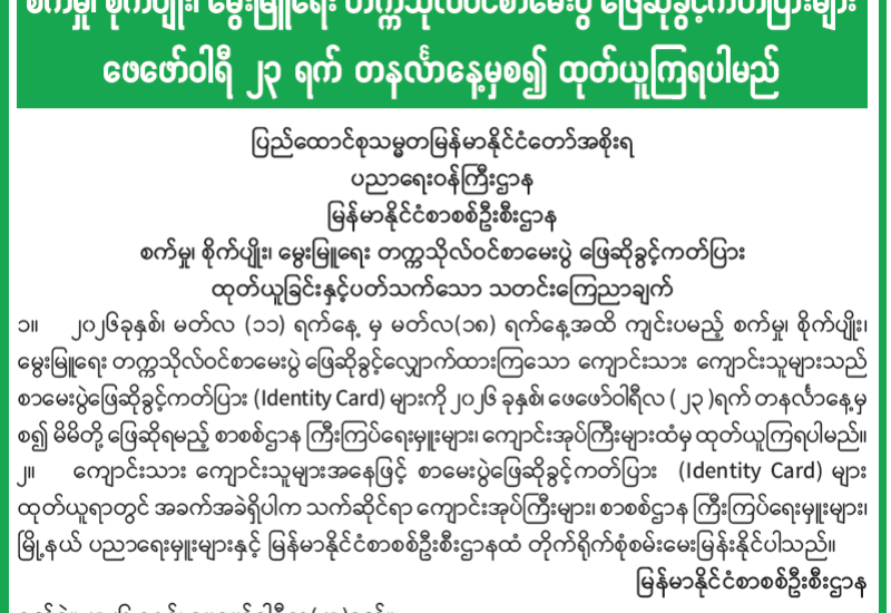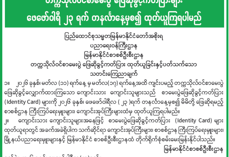 တက္ကသိုလ်ဝင်စာမေးပွဲ ဖြေဆိုခွင့်ကတ်ပြား ထုတ်ယူခြင်းနှင့်ပတ်သက်သော သတင်းကြေညာချက်