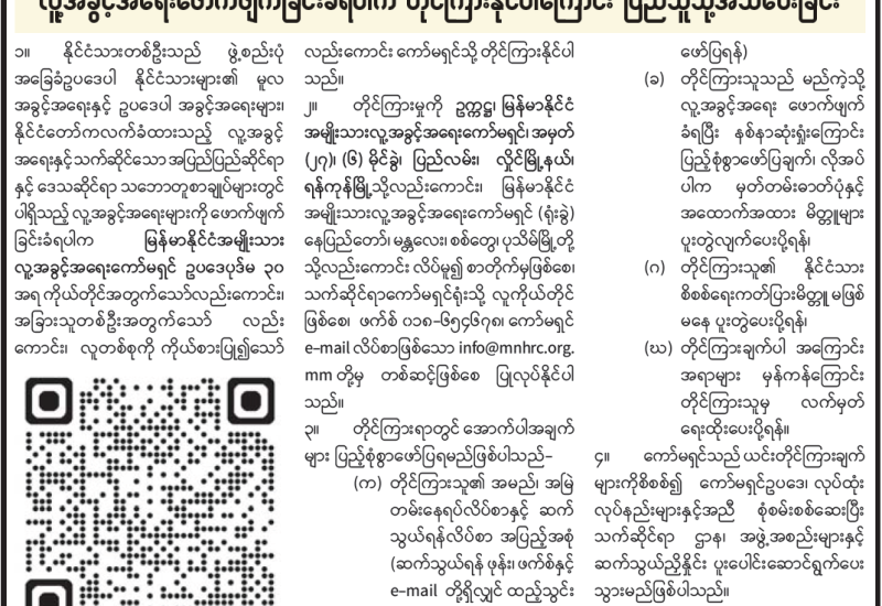 လူ့အခွင့်အရေးဖောက်ဖျက်ခြင်းခံရပါက တိုင်ကြားနိုင်ပါကြောင်း ပြည်သူသို့အသိပေးခြင်း