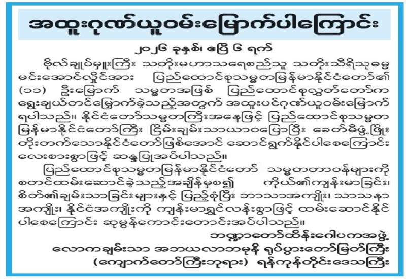 ၂၀၂၆ ခုနှစ်၊ ဧပြီလ ၃ ရက်တွင် ကျင်းပသည့် နိုင်ငံတော်သမ္မတရွေးချယ်တင်မြှောက်ပွဲ၌ ပြည်ထောင်စုလွှတ်တော်ကိုယ်စားလှယ်အားလုံးပါဝင်သော နိုင်ငံတော်သမ္မတရွေးချယ်တင်မြှောက်ရေးအဖွဲ့က ရွေးကောက်ခံ ပြည်သူ့လွှတ်တော်ကိုယ်စားလှယ်များအစုအဖွဲ့မှ ဒုတိယသမ္မတအဖြစ် ရွေးချယ်တင်မြှောက်ထားသော ဗိုလ်ချုပ်မှူးကြီး မင်းအောင်လှိုင်အား နိုင်ငံတော်သမ္မတအဖြစ် ရွေးချယ်တင်မြှောက်ခြင်းခံရသည့်အတွက် လောကချမ်းသာ အဘယလာဘမုနိရုပ်ပွားတော်မြတ်ကြီး (ကျောက်တော်ကြီးဘုရား) ဘဏ္ဍာတော်ထိန်းဂေါပကအဖွဲ့၊ မြန်မာနိုင်ငံလုံးဆိုင်ရာ MSME Cluster ဖိနပ်လုပ်ငန်းရှင်များဗဟိုအဖွဲ့ချုပ်၊ မြန်မာနိုင်ငံဆိုင်ရာ ရှန်ရှီးကုန်သည်ကြီးများအသင်းချုပ်၊ မြန်မာ-ဘယ်လာရုစ် ချစ်ကြည်ရေးနှင့် ပူးပေါင်းဆောင်ရွက်မှုတိုးမြှင့်ရေးအသင်း၊ မြန်မာနိုင်ငံတိုင်းရင်းဆေးဆရာအသင်း၊ မြန်မာပြည် တရုတ်ဗုဒ္ဓဘာသာရဟန်းတော်များအဖွဲ့၊ မဇ္ဈိမာလင်္ကာရသာမဏေကျော်အသင်း၊ ပုဂ္ဂလိကလုံခြုံရေးဝန်ဆောင်မှုလုပ်ငန်းရှင်များအသင်း၊ ထားဝယ်လူမျိုးစုစည်းမှုကော်မတီ (ဗဟို) တို့က အထူးဂုဏ်ယူဝမ်းမြောက်ကြောင်း ကြေညာချက်များ ထုတ်ပြန်ခဲ့ကြသည်။