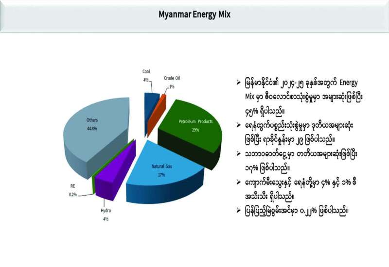 နိုင်ငံတော်၏စွမ်းအင်သုံးစွဲမှုတွင် ဓာတ်ဆီ၊ ဒီဇယ်ဆီ၊ ရေနံဓာတ်ငွေ့ရည် (LPG) စသည့် ရေနံထွက်ပစ္စည်းများသည် ၂၉ ရာခိုင်နှုန်း ပါဝင်ပြီး သယ်ယူပို့ဆောင်ရေးကဏ္ဍတွင် အဓိကအသုံးပြုလျက်ရှိပါသည်။