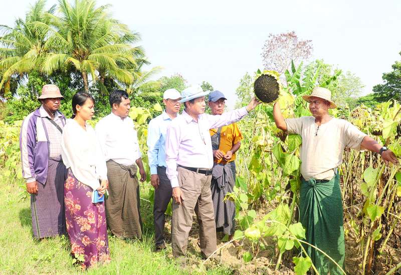 စိုက်ပျိုးရေး၊ မွေးမြူရေးနှင့်ဆည်မြောင်းဝန်ကြီးဌာန ဒုတိယဝန်ကြီး ဒေါက်တာတင်ထွဋ်သည် ယနေ့နံနက်ပိုင်းတွင် နေပြည်တော် ကောင်စီနယ်မြေ ပုဗ္ဗသီရိမြို့နယ်တွင် တောင်သူများ စိုက်ပျိုးထားသည့် မျိုးမြှင့်တင်ပေးထားသော ဆင်းရွှေကြာ-၂ နေကြာစိုက်ခင်းများ ဖြစ်ထွန်းအောင်မြင်နေမှုကို ကြည့်ရှုသည်။