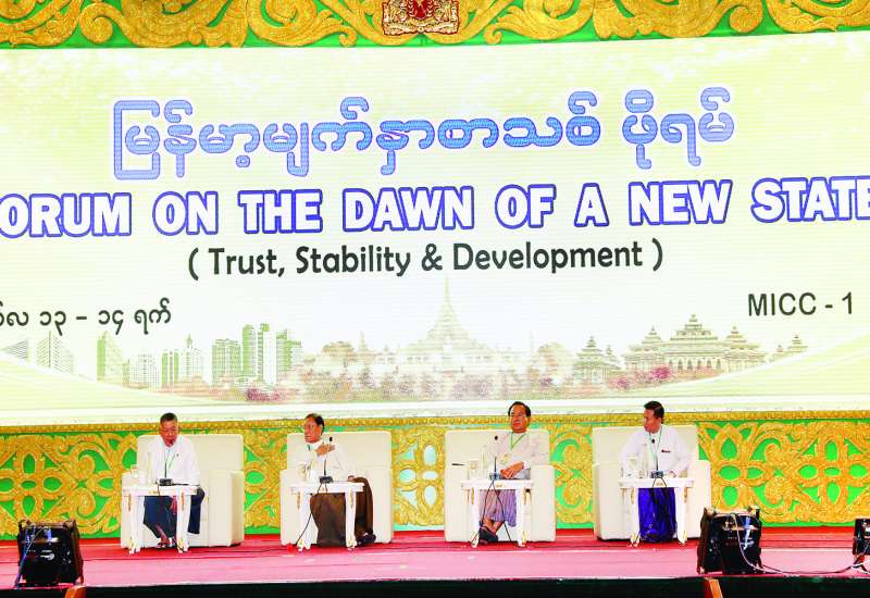“မြန်မာ့မျက်နှာစာသစ်ဖိုရမ်” (ယုံကြည်မှု၊ တည်ငြိမ်အေးချမ်းမှုနှင့်ဖွံ့ဖြိုးတိုးတက်မှု) “Forum on The Dawn of A New State” (Trust, Stability & Development) ဒုတိယနေ့ကို ယနေ့တွင် နေပြည်တော်ရှိ မြန်မာအပြည်ပြည်ဆိုင်ရာကွန်ဗင်းရှင်းဗဟိုဌာန(၁)(MICC I) ၌ ကျင်းပသည်။