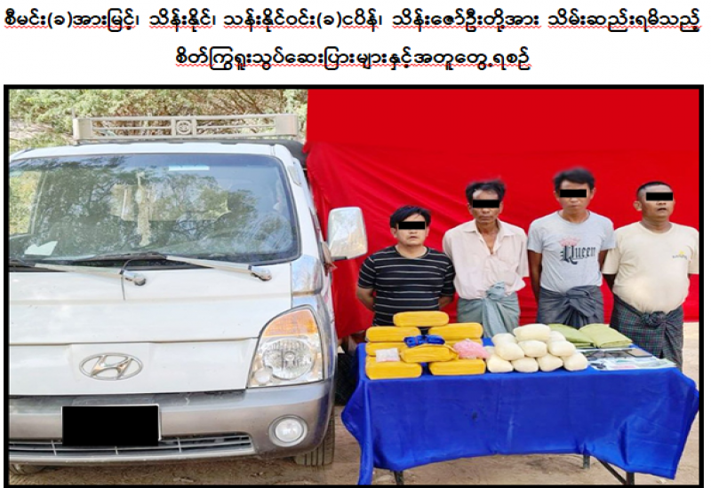 မူးယစ်ဆေးဝါးတားဆီးနှိမ်နင်းရေးရဲတပ်ဖွဲ့မှ တပ်ဖွဲ့ဝင်များ ပါဝင်သောပူးပေါင်းအဖွဲ့သည် ဧပြီ ၉ ရက် ညနေ ၄ နာရီတွင် ဝိုင်းမော်မြို့နယ်၊ ဆဒုံး-ဝိုင်းမော်သွားကားလမ်း၊ (၁၃)ကီလိုမီတာ ပူးပေါင်း စစ်ဆေးရေးစခန်းတွင် လွမ်းထော(ခ)မောင်တာ မောင်းနှင်ပြီး မအေးရီ လိုက်ပါလာသော မော်တော် ဆိုင်ကယ်ကို ရပ်တန့်စစ်ဆေးရှာဖွေရာ ဘိန်းစိမ်း ၁၀ ကီလို ကိုလည်းကောင်း။