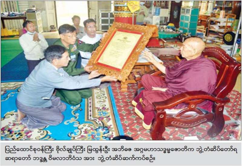 စစ်ကိုင်းတိုင်းဒေသကြီး ရွှေဘိုမြို့ ပခန်းကျောင်းတိုက်ဆရာတော် အဂ္ဂမဟာပဏ္ဍိတ ဘဒ္ဒန္တ ဝိမလာဘိဝံသအား ယနေ့ နံနက်ပိုင်းတွင် နိုင်ငံတော်စီမံအုပ်ချုပ်ရေးကောင်စီအဖွဲ့ဝင်၊ ကာကွယ်ရေးဝန်ကြီးဌာန ပြည်ထောင်စုဝန်ကြီး ဗိုလ်ချုပ်ကြီး မြထွန်းဦးနှင့်အဖွဲ့ဝင်များက သွားရောက်ဖူးမြော်ကြည်ညိုပြီး နိုင်ငံတော်စီမံအုပ်ချုပ်ရေးကောင်စီမှ ဆက်ကပ်သည့် သာသနာတော်ဆိုင်ရာ ဘွဲ့တံဆိပ်ဖြစ်သော အဘိဓဇ အဂ္ဂမဟာသဒ္ဓမ္မ ဇောတိက ဘွဲ့တံဆိပ်အား ဆက်ကပ်ပူဇော်ကာ လှူဖွယ်ပစ္စည်းများ ဆက်ကပ်လှူဒါန်းကြသည်။
