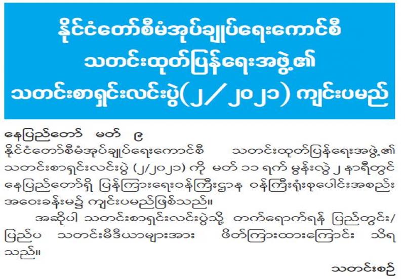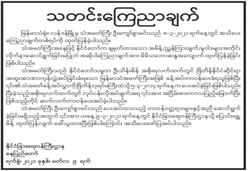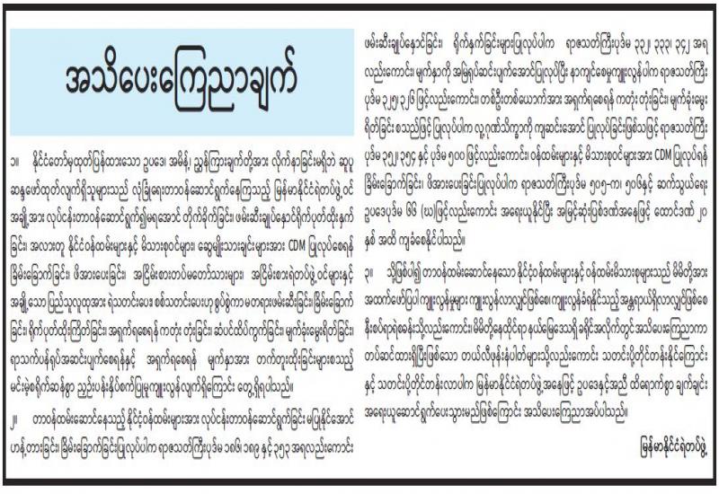 (၂၀၂၁ ခုနှစ်၊ မတ်လ (၉)ရက်နေ့ ည(၇:၀၀)နာရီအချိန် ထုတ်ပြန်ချက်)