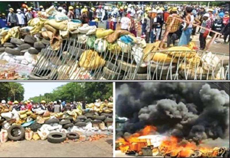 နိုင်ငံတော်ဆန့်ကျင်ရေးကို ဦးတည်ဆောင်ရွက်နေသည့် အဖွဲ့အစည်း များအနေဖြင့် နေရာဒေသအချို့၌ ဥပဒေများအား ချိုးဖောက်ကာ သာမန် လူစုလူဝေးဖြင့် အများပြည်သူ အသုံးပြု သွားလာနေသည့် လမ်းကြောင်း များအား တာယာကွင်းများ အစုအပုံ လိုက်ဖြင့် တားဆီးခြင်း၊ မီးရှို့ခြင်း၊ သစ်ပင်သစ်ကိုင်းများအား ခုတ်လှဲ၍ လမ်းပိတ်ဆို့ခြင်း၊ ကွန်ကရစ်တုံးများ ချထား၍ လမ်းပိတ်ဆို့ခြင်းများပြုလုပ် ခြင်း၊ လုံခြုံရေးတပ်ဖွဲ့ဝင်များအား ဂျင်ကလိ၊ လောက်လေးခွ၊ သံဆူးချွန် များဖြင့် ပစ်ခတ်ခြင်း၊ ဒေသအချို့တွင် တူမီးနှင့် လေသေနတ်များ အသုံးပြု ပစ်ခတ်ခြင်း၊ လုံခြုံရေးတပ်ဖွဲ့ဝင် များအား ဖမ်းဆီးနှိပ်စက်ခြင်း၊ လုံခြုံရေး ကင်မရာ (CCTV) များအား ဖျက်ဆီးခြင်း နှင့် ပြည်သူပိုင်ယာဉ်များအား ဖျက်ဆီး ခြင်း စသည့်လုပ်ငန်းများကို အကြမ်း ဖက်အဖွဲ့အစည်းပုံစံဖြင့် အဖျက် အမှောင့်လုပ်ငန်းများ လုပ်ဆောင် နေကြသည်ကို တွေ့ရှိရကြောင်း မြန်မာနိုင်ငံရဲတပ်ဖွဲ့၏ သတင်း ထုတ်ပြန်ချက်အရ သိရသည်။