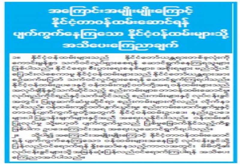 ၁။ မြန်မာနိုင်ငံသတင်းမီဒီယာကောင်စီဝင် ရွေးချယ်တင်မြှောက်ရေးအဖွဲ့သည် မြန်မာနိုင်ငံ သတင်း မီဒီယာကောင်စီဝင် လစ်လပ်နေရာများအတွက် ကိုယ်စားလှယ်လောင်း အဆိုပြုလွှာပုံစံများကို (၂၆-၂-၂၀၂၁)ရက် သောကြာနေ့မှ (၃-၃-၂၀၂၁)ရက်ဗုဒ္ဓဟူးနေ့အထိ နေ့စဉ်နံနက်(၉:၀၀)နာရီမှ မွန်းလွဲ (၁၆:၀၀)နာရီအတွင်း(ပိတ်ရက်မရှိ) ပြန်ကြားရေးနှင့်ပြည်သူ့ ဆက်ဆံရေးဦးစီးဌာန၊ မူပိုင်ခွင့်နှင့် မှတ်ပုံတင်ဌာနခွဲ၊ အမှတ်(၄)၊ ဝင်္ကပါလမ်း၊ ဗဟန်းမြို့နယ်၊ ရန်ကုန်တိုင်းဒေသကြီးတွင် အခမဲ့လာရောက်ထုတ်ယူနိုင်ပြီး (၃-၃-၂၀၂၁) ရက် ဗုဒ္ဓဟူးနေ့ မွန်းလွဲ(၁၆:၀၀)နာရီမတိုင်မီအချိန်အတွင်း အဆိုပြုလွှာပုံစံများကို နောက်ဆုံးထားပြန်လည်တင် သွင်း ရန် နေ့စဉ်ထုတ် သတင်းစာများတွင် ဖိတ်ခေါ်ထားပါသည်။ ။
