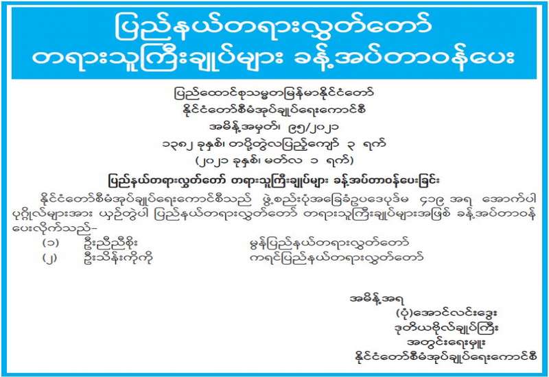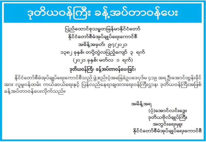 ပြန်ကြားရေးဝန်ကြီးဌာနစုပေါင်းခန်းမတွင် ယနေ့ညနေပိုင်းက လုပ်ငန်းညှိနှိုင်းအစည်းအဝေးကို ကျင်းပရာ ပြည်ထောင်စုဝန်ကြီး ဦးချစ်နိုင်က ဦးဆောင်လျက် ဒုတိယဝန်ကြီးများ၊ ညွှန်ကြားရေး မှူး ချုပ်များ၊ ဦးဆောင်ညွှန်ကြားရေးမှူးများနှင့် ဒုတိယညွှန်ကြားရေးမှူးချုပ်များ တက်ရောက် ကြကြောင်း သိရသည်။