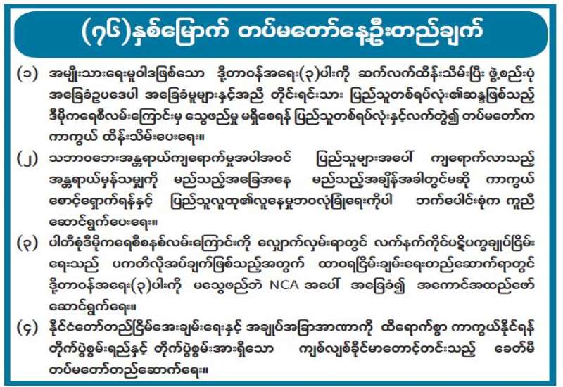 တပ်မတော်အနေဖြင့် ဖွဲ့စည်းပုံအခြေခံဥပဒေ(၂၀၀၈ ခုနှစ်)ပါ ပြဋ္ဌာန်းချက်များအား လေးစား လိုက်နာလျက် နိုင်ငံတော်၏ တာဝန်အရပ်ရပ်အားယာယီသမ္မတမှလွှဲပြောင်း တာဝန်ပေးအပ် ထားသည့် ဖေဖော်ဝါရီ ၁ ရက်မှစ၍ ခေတ္တထိန်းသိမ်းဆောင်ရွက် လျက်ရှိကာ နိုင်ငံတော် စီမံအုပ်ချုပ်ရေးကောင်စီကို ဖွဲ့စည်းပြီး ရှေ့လုပ်ငန်းစဉ်(၅)ရပ်၊ ဦးတည်ချက်(၉) ရပ်ချမှတ်၍ နိုင်ငံတော်၏ နိုင်ငံရေး၊ စီးပွားရေး၊ လူမှုရေး စသည့်ဘက်ပေါင်းစုံမှ တိုးတက်ကောင်းမွန် လာစေရန် အင်တိုက်အားတိုက် ဆောင်ရွက်လျက် ရှိသည်။