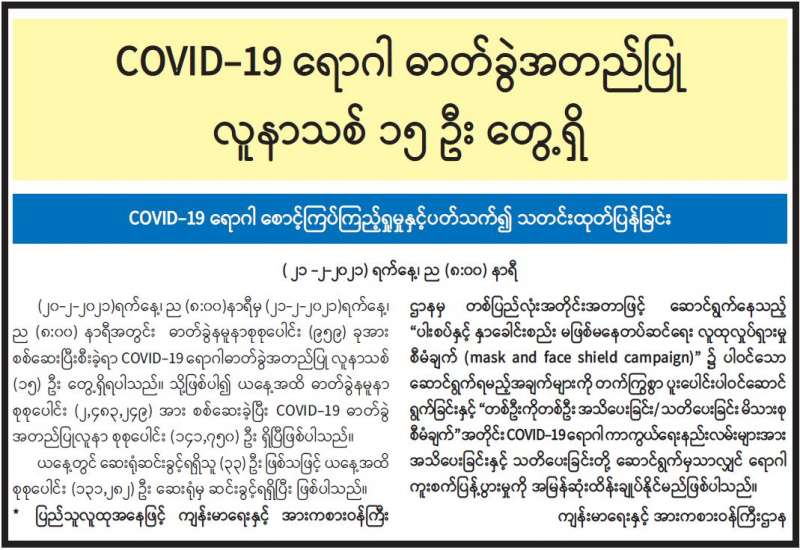 COVID-19 ရောဂါ ဓာတ်ခွဲအတည်ပြု လူနာသစ် ၁၅ ဦး တွေ့ရှိ